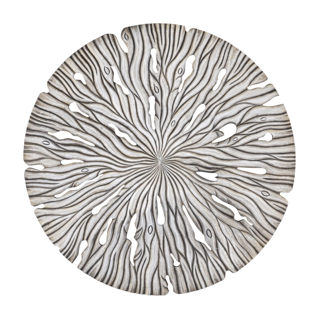 Rond MDF-wandpaneel met golvende, gebeeldhouwde textuur in zachte crèmekleur. Handgemaakt kunstpaneel dat elegantie en diepte toevoegt aan elk interieur.