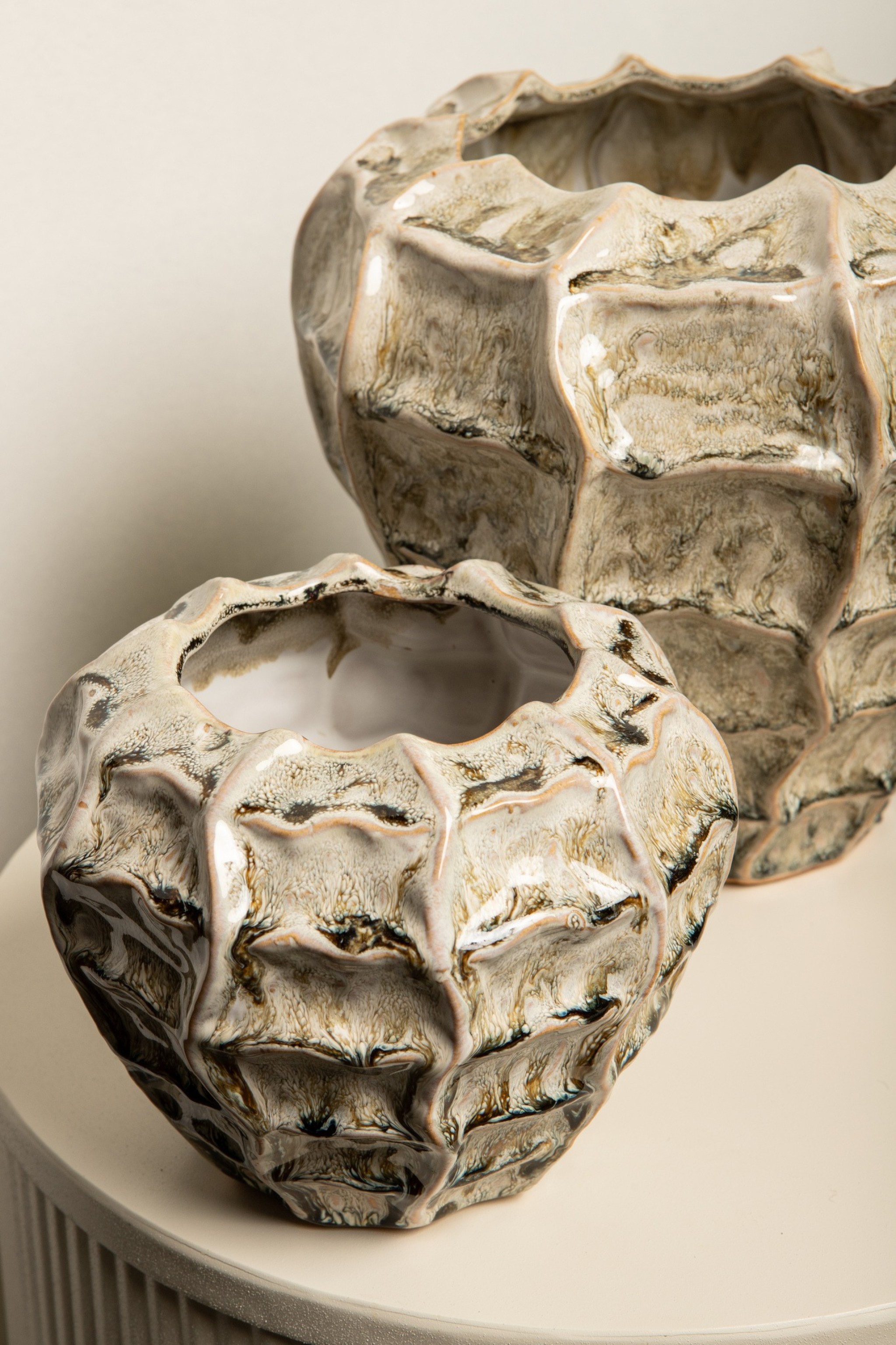 Ronde keramische pot in crème met golvende vorm en subtiele kleurenmix. Formaat 23×19×23 cm, gewicht 1 kg. Perfect voor middelgrote planten of als decoratief accent.