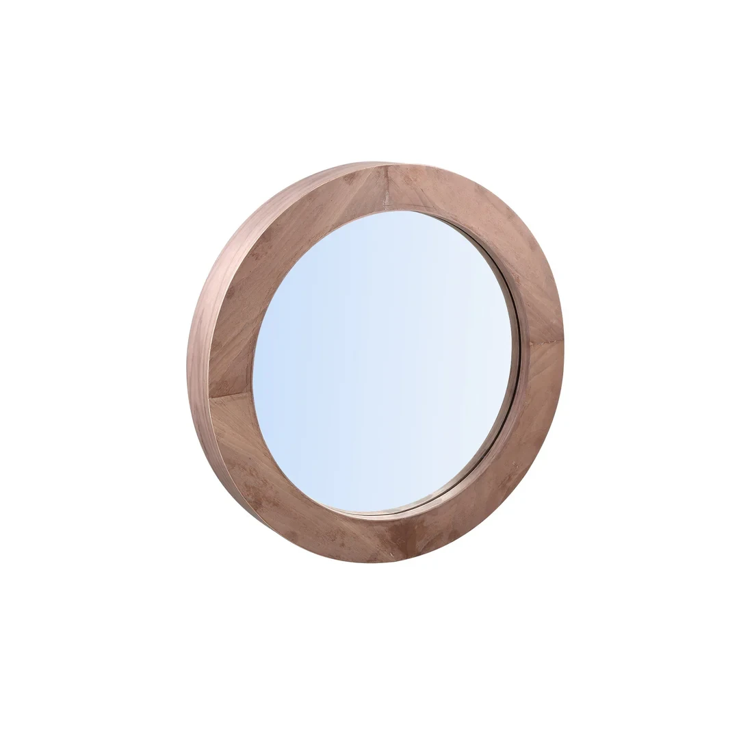 Kleine ronde spiegel met dik firwood fineerframe. Elegant en natuurlijk statement piece dat licht en stijl toevoegt aan elk interieur. Afmetingen: 60x60x8 cm.