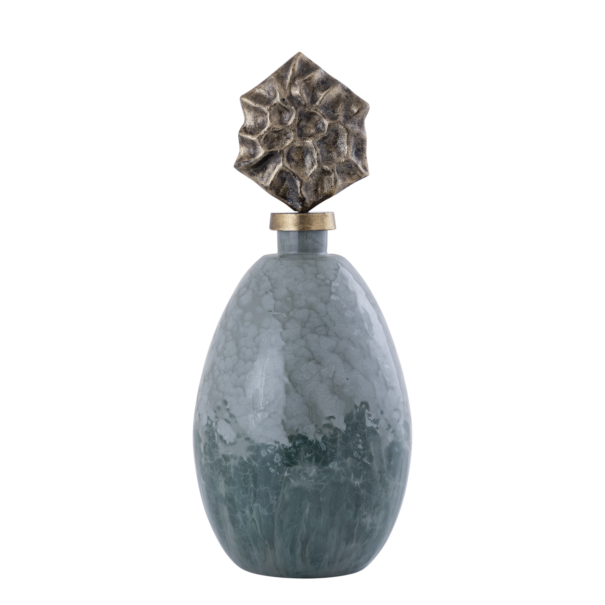 Met een formaat van 23W x 49H x 23L cm en een gewicht van 1 kg, combineert dit beeld visuele impact met een verfijnde afwerking. Het contrast tussen het groene glas en het glanzende messing deksel geeft het beeld een moderne, luxe uitstraling die zowel in klassieke als eigentijdse interieurs past.