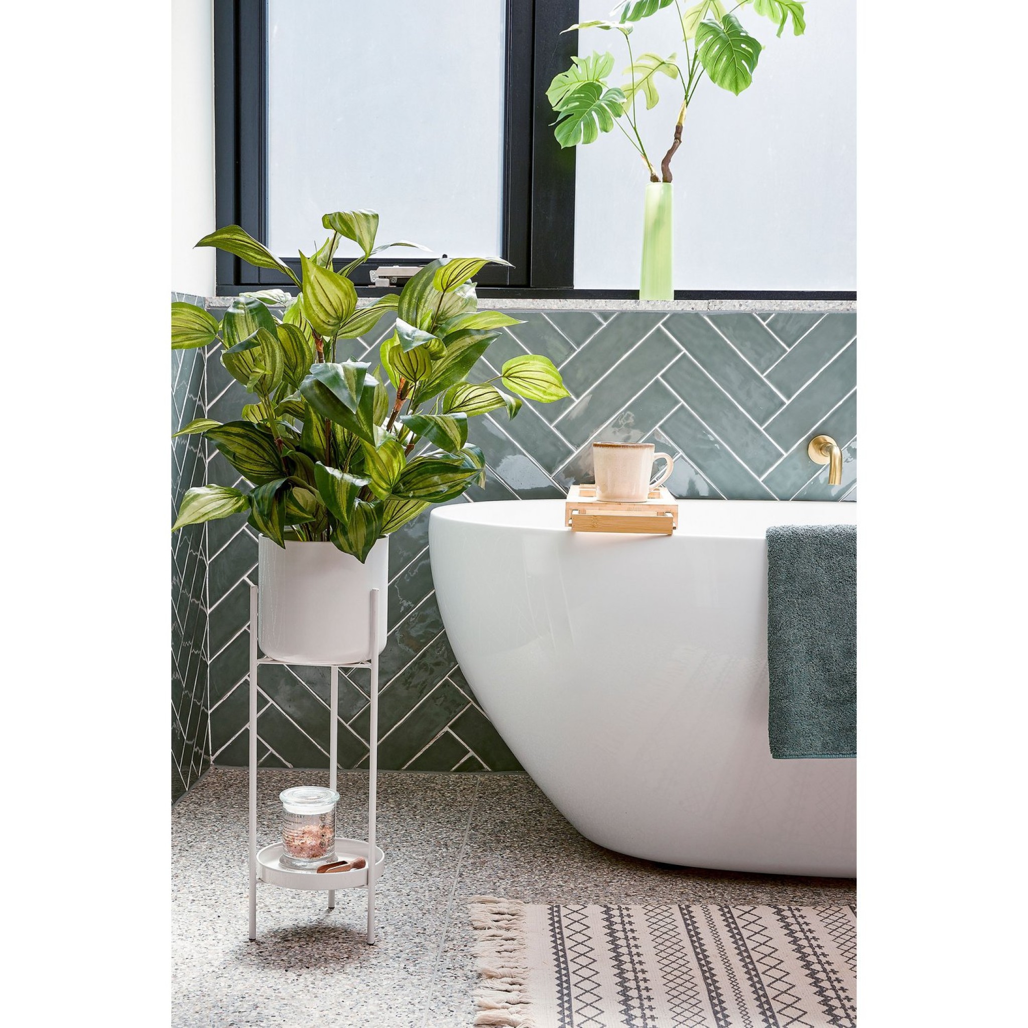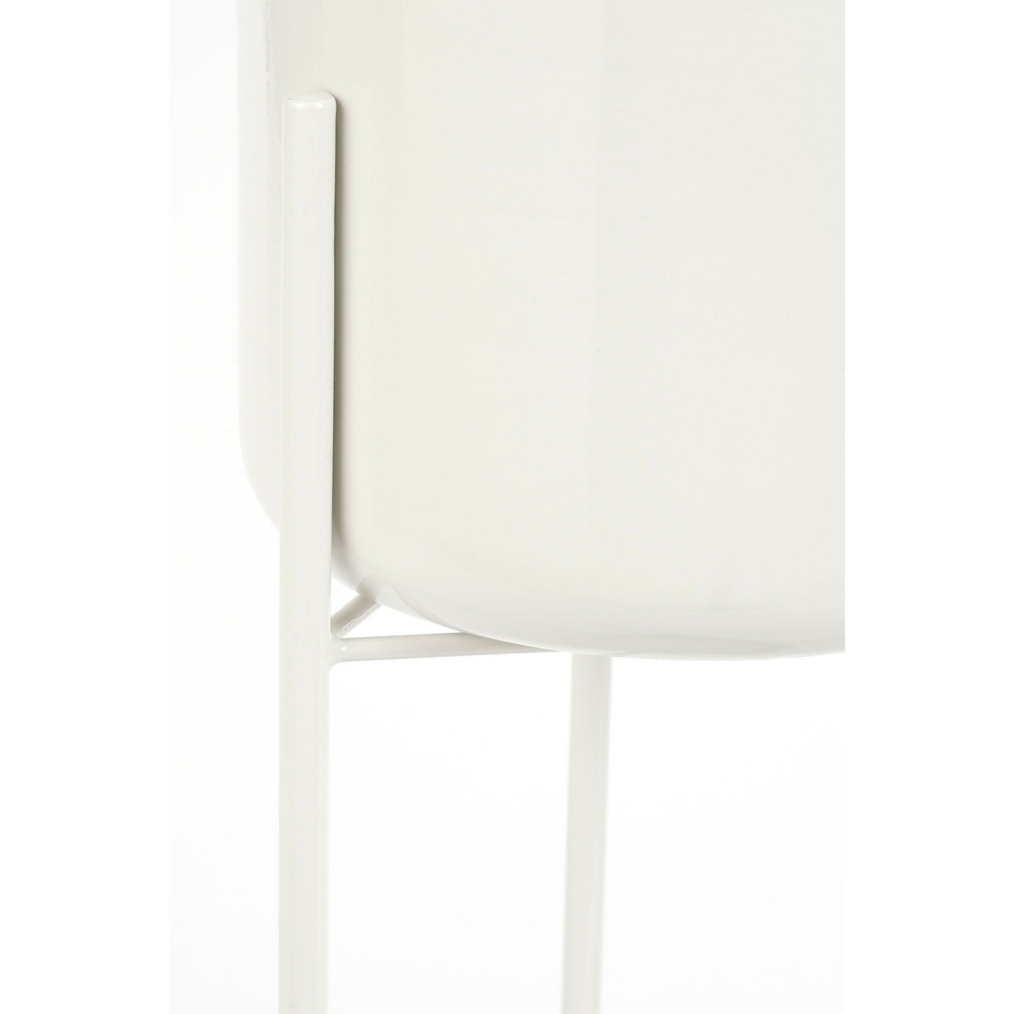 Stijlvolle witte bloempot op standaard van ijzer. Het slanke, open ontwerp geeft een ruimtelijk effect en past in elk interieur. Stevig, waterresistant en voorzien van plateau voor extra decoratie.