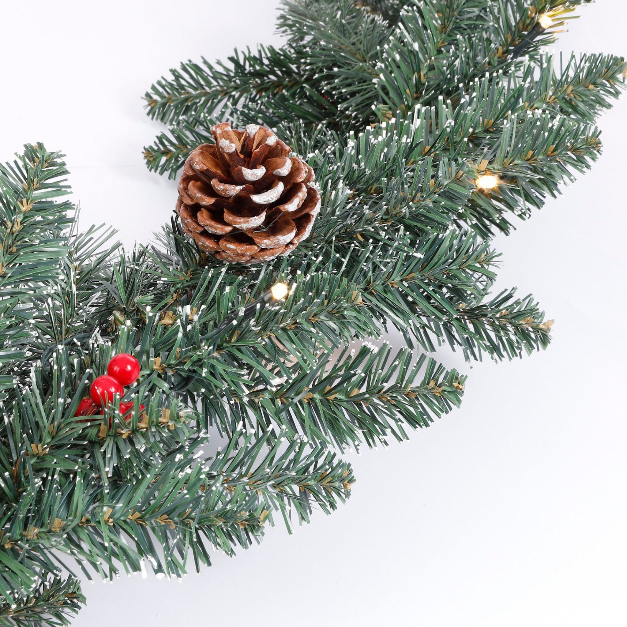 De slinger is feestelijk gedecoreerd met dennenappels en rode besjes, en is voorzien van 30 warm witte LED-lampjes. De verlichting werkt op 3 AA-batterijen, zodat je geen rekening hoeft te houden met een stopcontact.