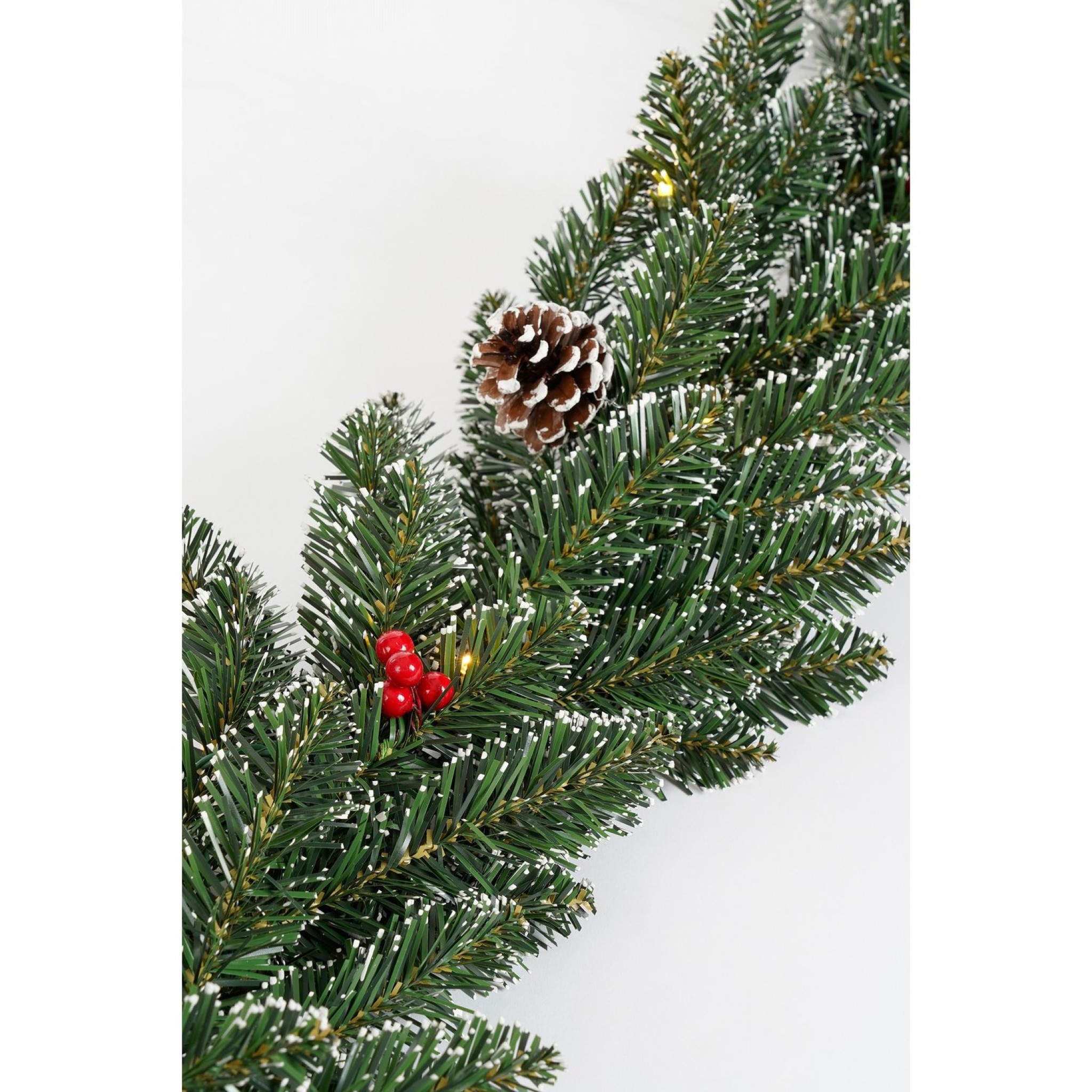 De Creston guirlande van Black Box Trees is 2,7 meter lang, groen met bevroren witte tips, gedecoreerd met dennenappels en rode besjes. Inclusief 30 warm witte LED-lampjes op batterijen. Perfect voor vensterbanken, kasten of trapleuningen.