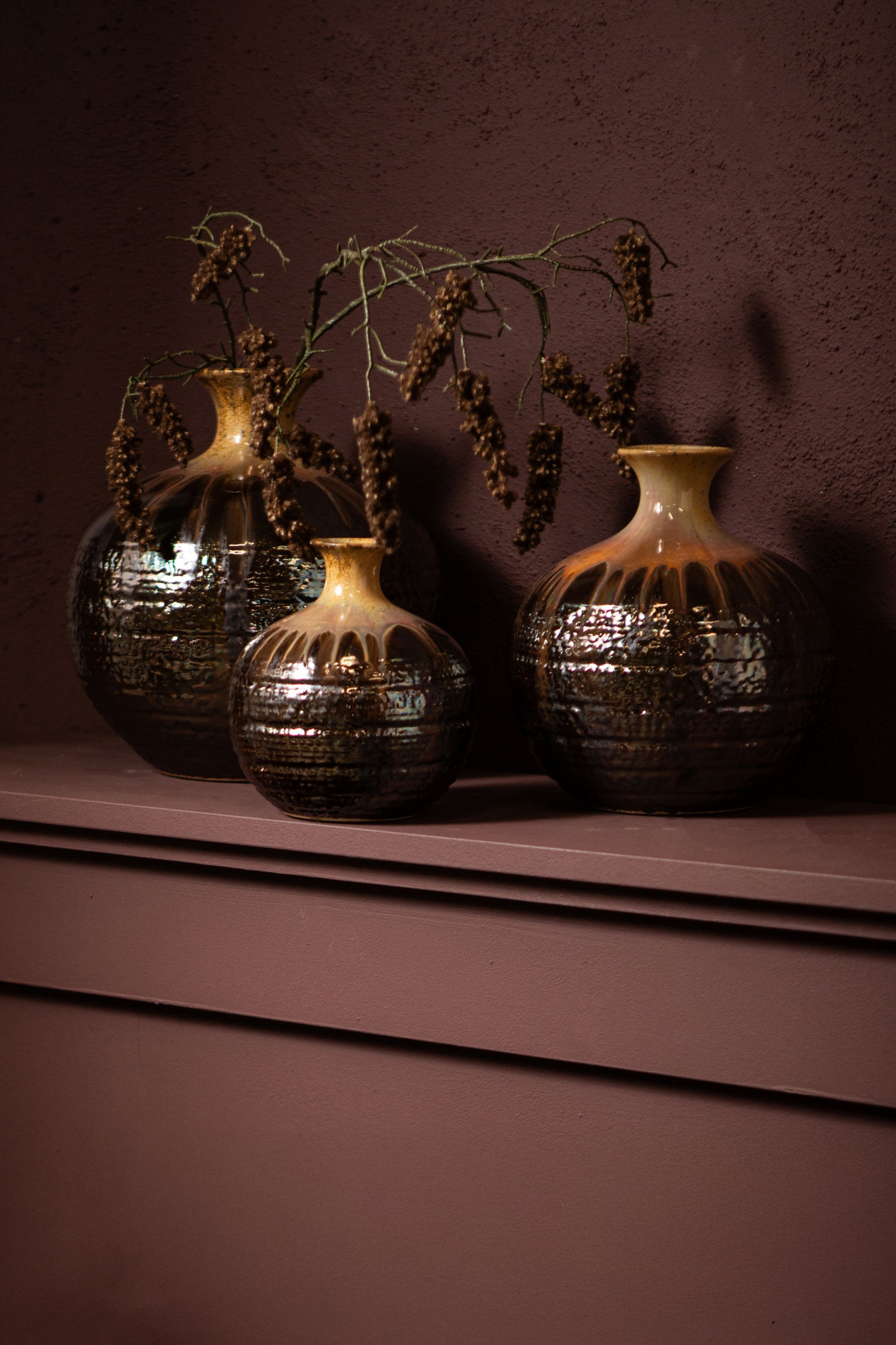 Darlan Gun Metal Bulby Ceramic Vaas | Beige/Oranje Gevlamd M – 21×22×21 cm