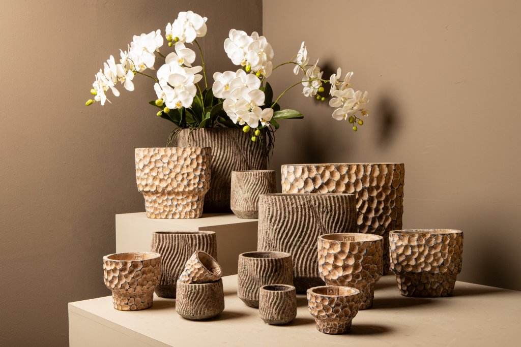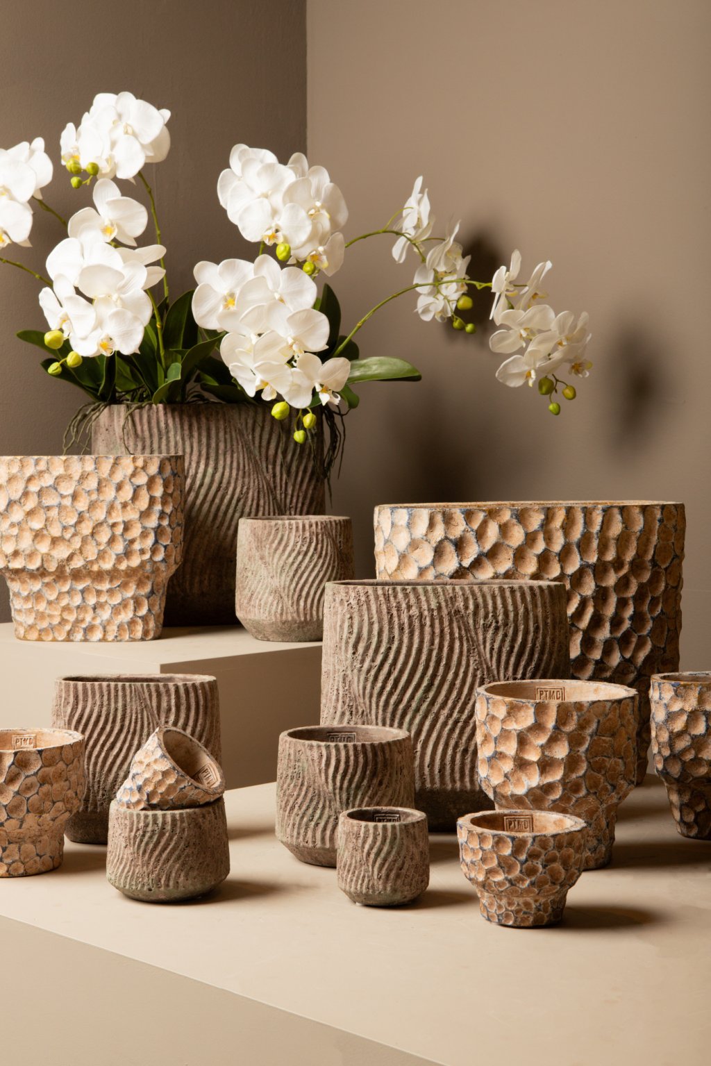 Met een hoogte van 28 cm en een breedte van 15 cm biedt deze M-maat voldoende ruimte voor middelgrote kamerplanten, vetplanten of kruiden. Het cementmateriaal zorgt voor duurzaamheid en stabiliteit, terwijl de ruwe textuur en golvende details een ambachtelijke en moderne uitstraling geven.