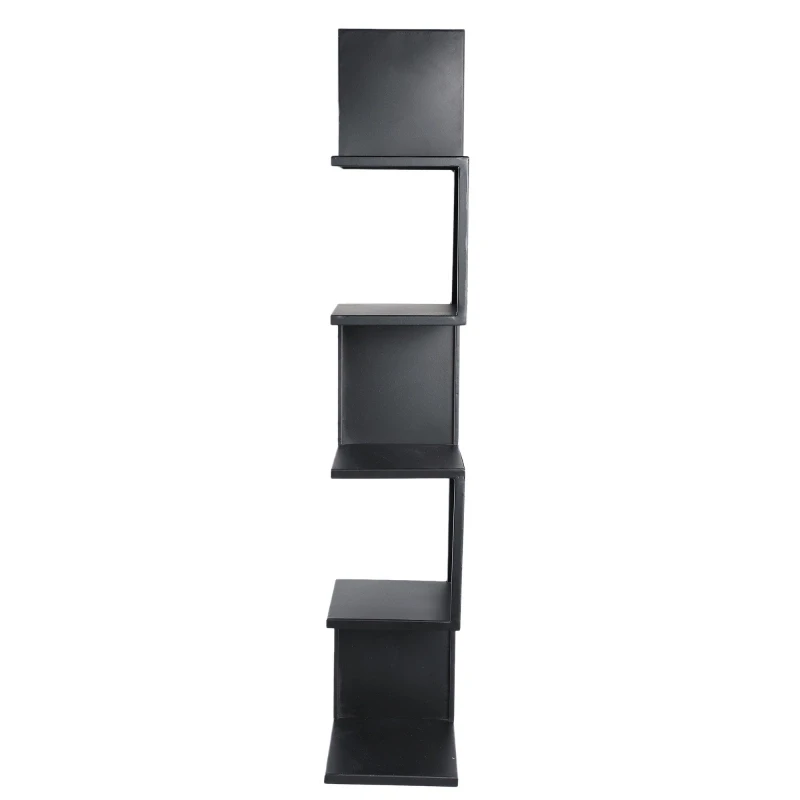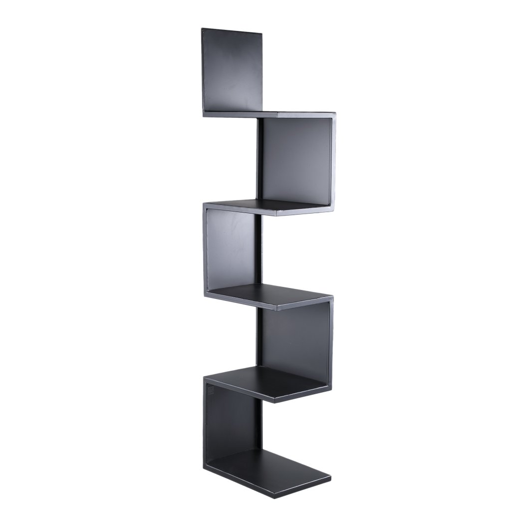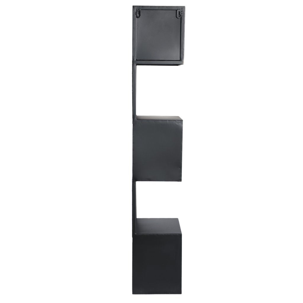 Zwart stalen wandrek met rechthoekige vorm en meerdere plateaus. Ideaal voor het opbergen en presenteren van accessoires in woonkamer of hal.
