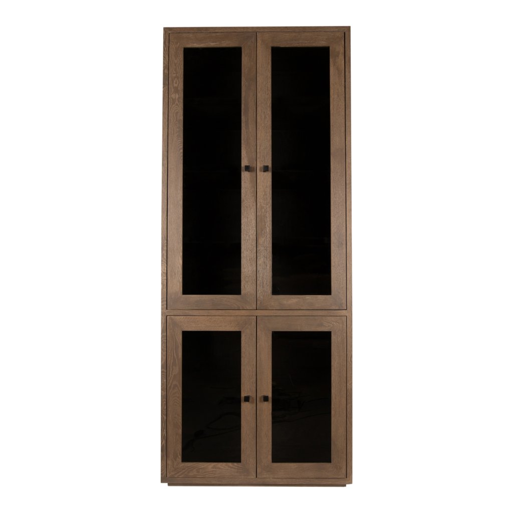 Stijlvolle grijze eikenkast Armarium met 4 deuren van glas, met metalen en eikenhouten details. Perfect voor opbergen en tentoonstellen van decoratie en servies.
