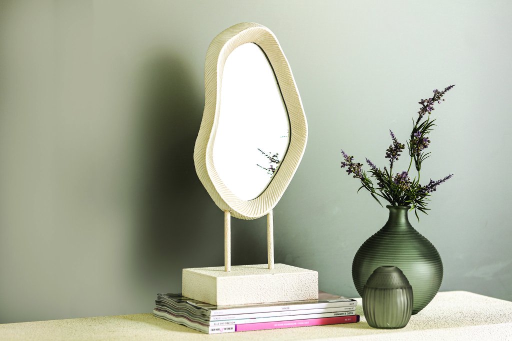 Elegante organische spiegel met wit polyframe op hoge MDF-voet. Stijlvol accentstuk voor kast, dressoir of haltafel. Afmetingen: 22x49x14 cm.