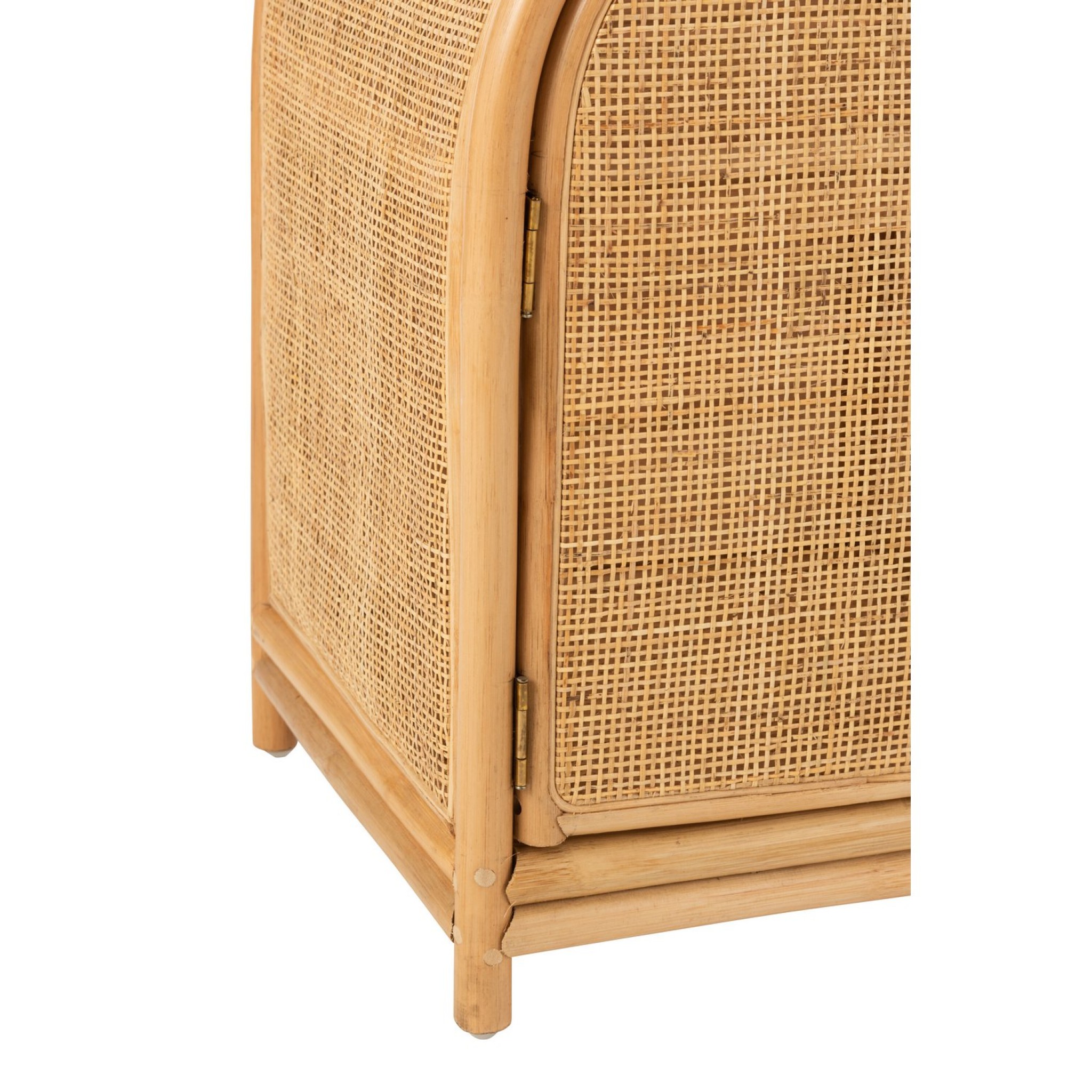 Kleine rotan kast Ellen met 2 deuren en jute details in naturel kleur. Stijlvol, compact en ideaal voor woonkamer, slaapkamer of loungehoek.
