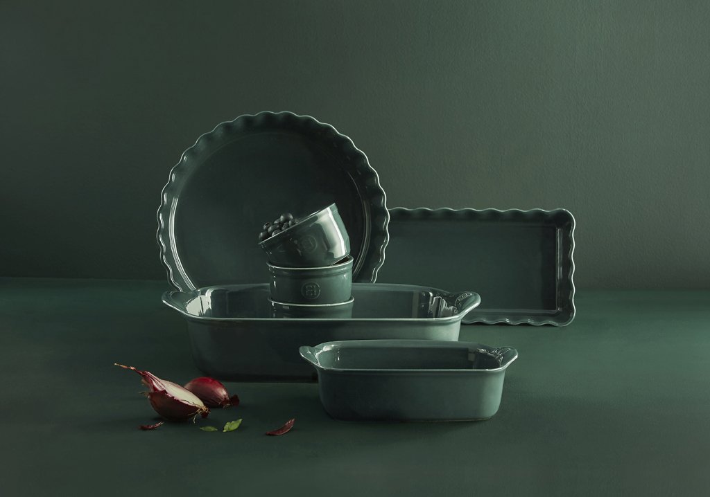 Handgemaakte rechthoekige keramieken schaal van Emile Henry in groen. Geschikt voor oven, magnetron en vaatwasser. Uitstekend warmtebehoud en kras- & stootvast.