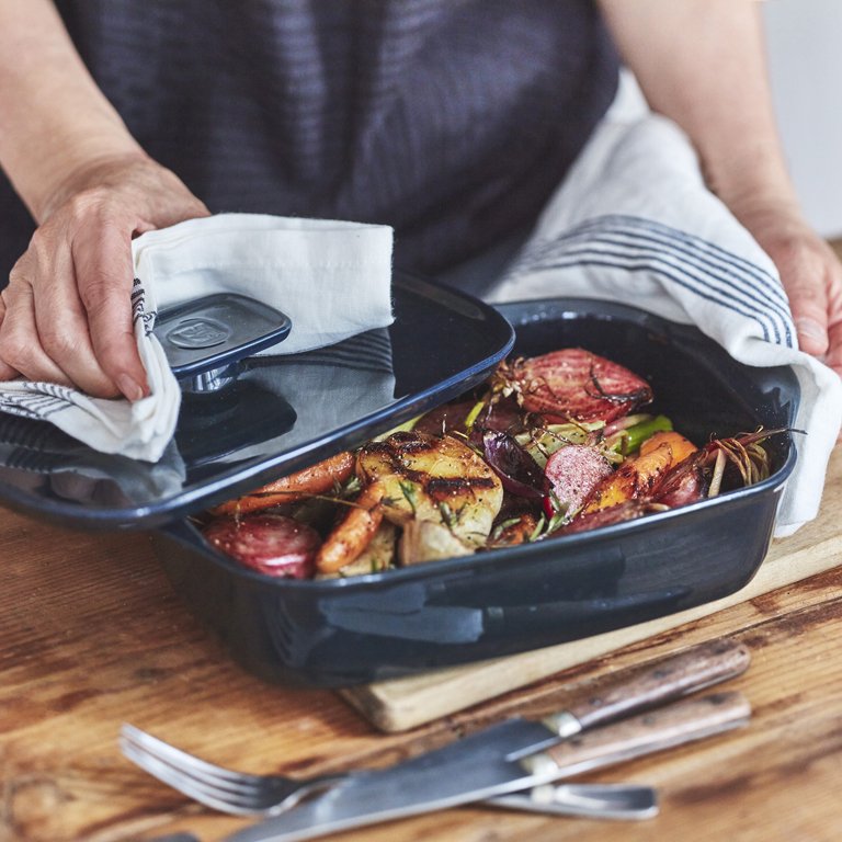 Handgemaakte rechthoekige schaal van Emile Henry in Cèdre HR® keramiek. Perfect voor lasagne, gratins of gebraden vlees. Oven- en magnetronbestendig, uitzonderlijk warmtebehoud, kras- en stootvast, vaatwasmachinebestendig en direct vanuit de vriezer te gebruiken.