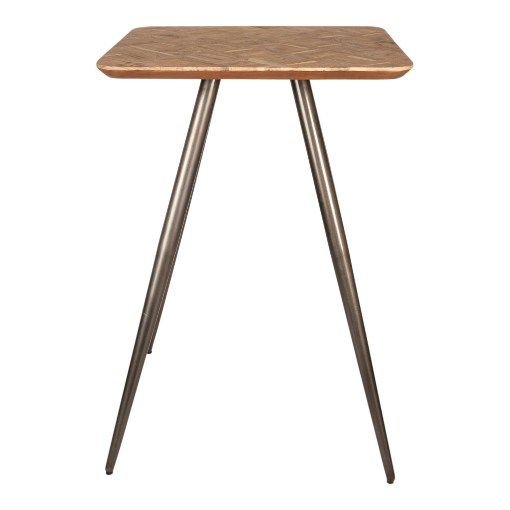 De Fieron Natural Wooden Bar Table Square is een stijlvolle barkruktafel van hoogwaardig natuurlijk hout. Het vierkante blad rust op dunne, uitstaande ronde poten met een subtiel verjongd visgraatpatroon, wat de tafel een elegante en lichte uitstraling geeft.