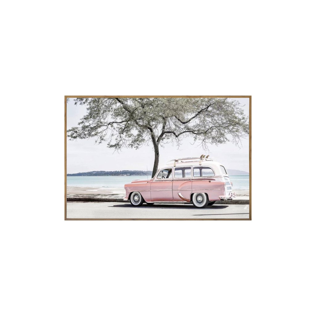 Het Wall Art – Travel wandpaneel van PTMD is een artistiek hoogwaardig glazen paneel dat een levendige scène van een roze auto met wit dak en bagagedrager over een schilderachtige strandweg vastlegt. Dankzij de fotoprint op glanzend glas komen kleuren, diepte en reflectie prachtig tot leven.