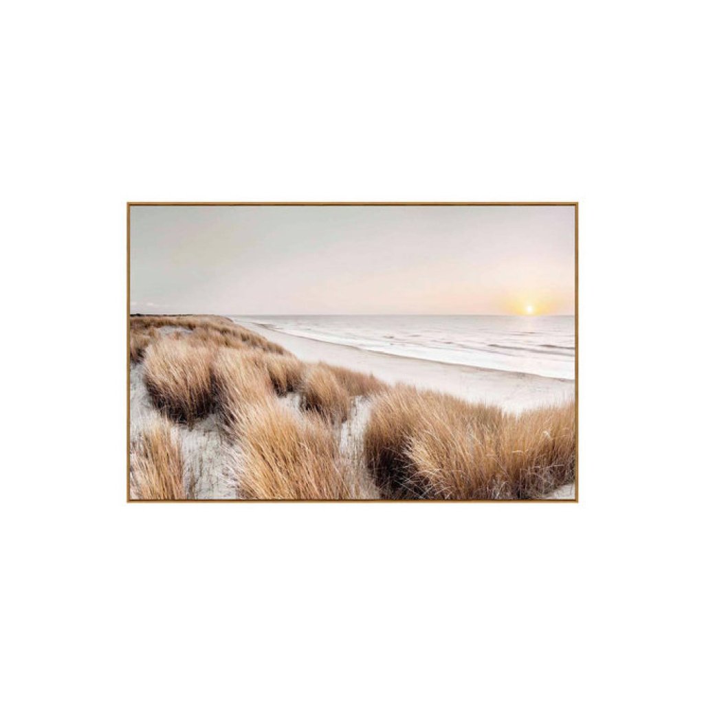 Het Wall Art – Warm Sun glaswandpaneel van PTMD combineert natuurgetrouwe fotografie met een luxueus glanzend glazen oppervlak. Het beeld toont een betoverend duinlandschap met een ondergaande zon boven de zee, waarbij de warme zonnestralen het landschap verlichten en een serene sfeer creëren.