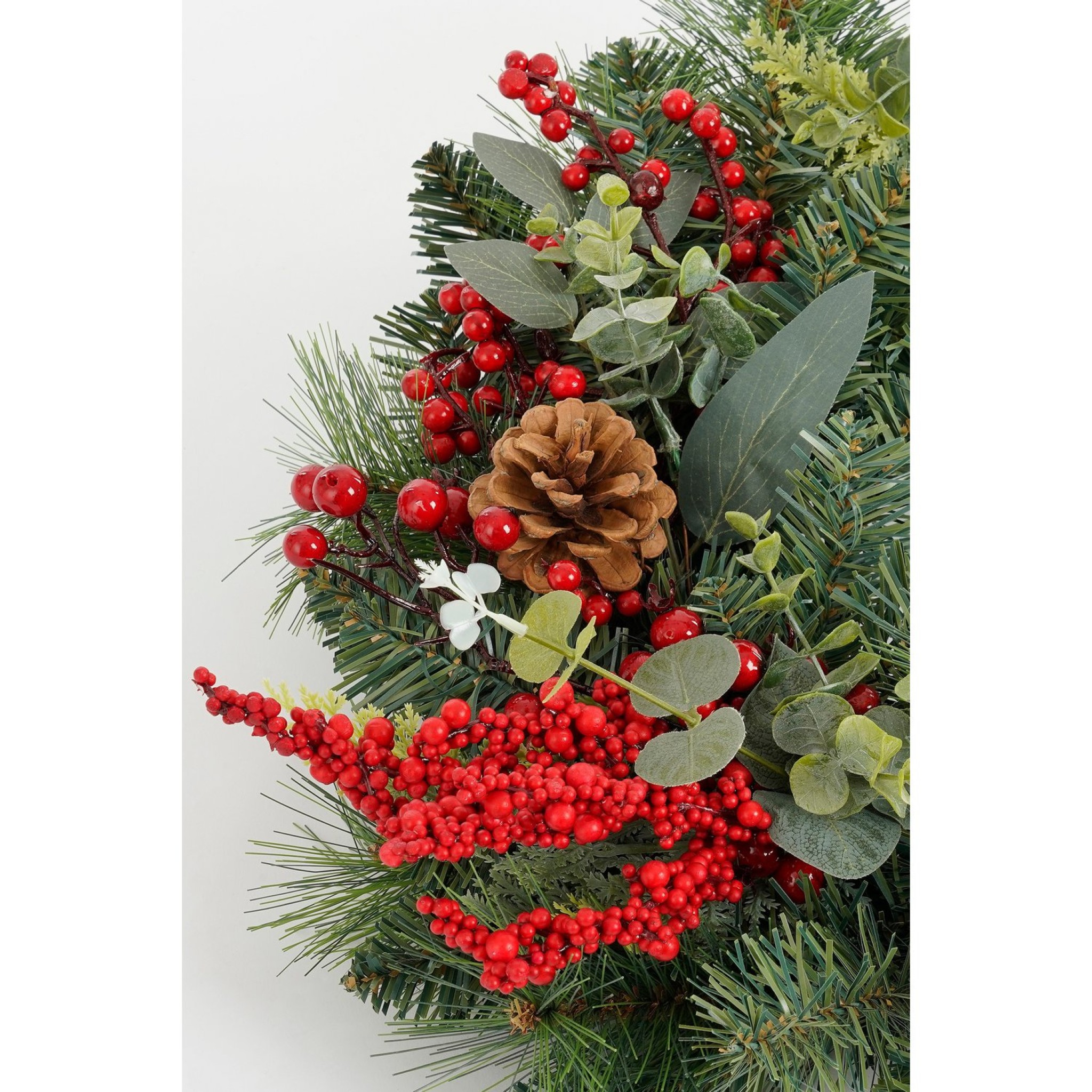Haal de magie van Kerstmis in huis met de Harvey Kerstkrans met Dennenappels – H11ר40 cm van Mica Decorations. Deze feestelijke krans combineert volle, groene naalden met felrode bessen, natuurlijke dennenappels en groene bladeren, waardoor hij een warme en klassieke uitstraling krijgt die perfect past bij een traditioneel kerstinterieur.