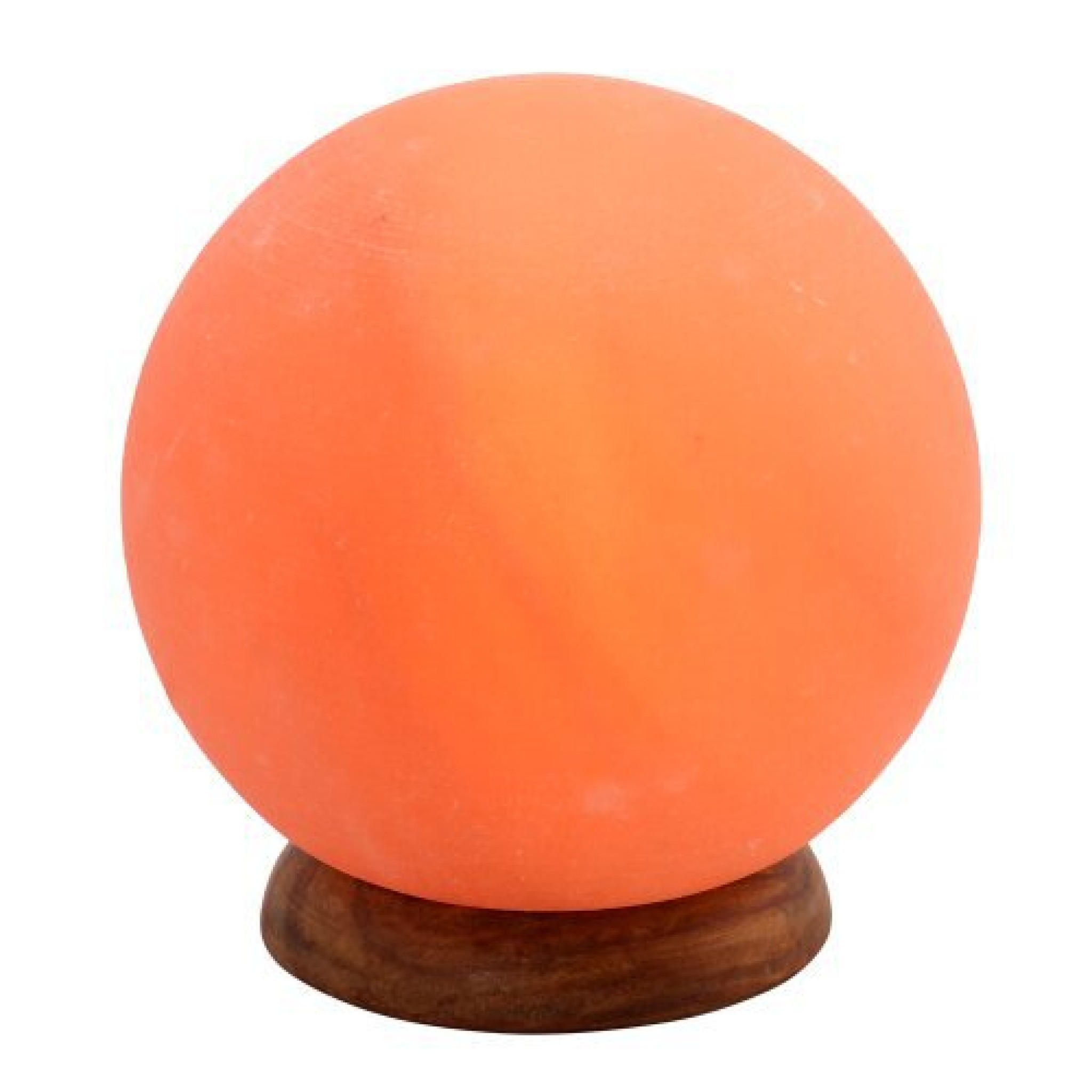 Handgemaakte oranje zoutlamp “Planet” van Himalaya Salt Dreams. Uniek bolvormig zoutkristal op houten voet, puur natuur en exclusief voor binnenshuis gebruik.