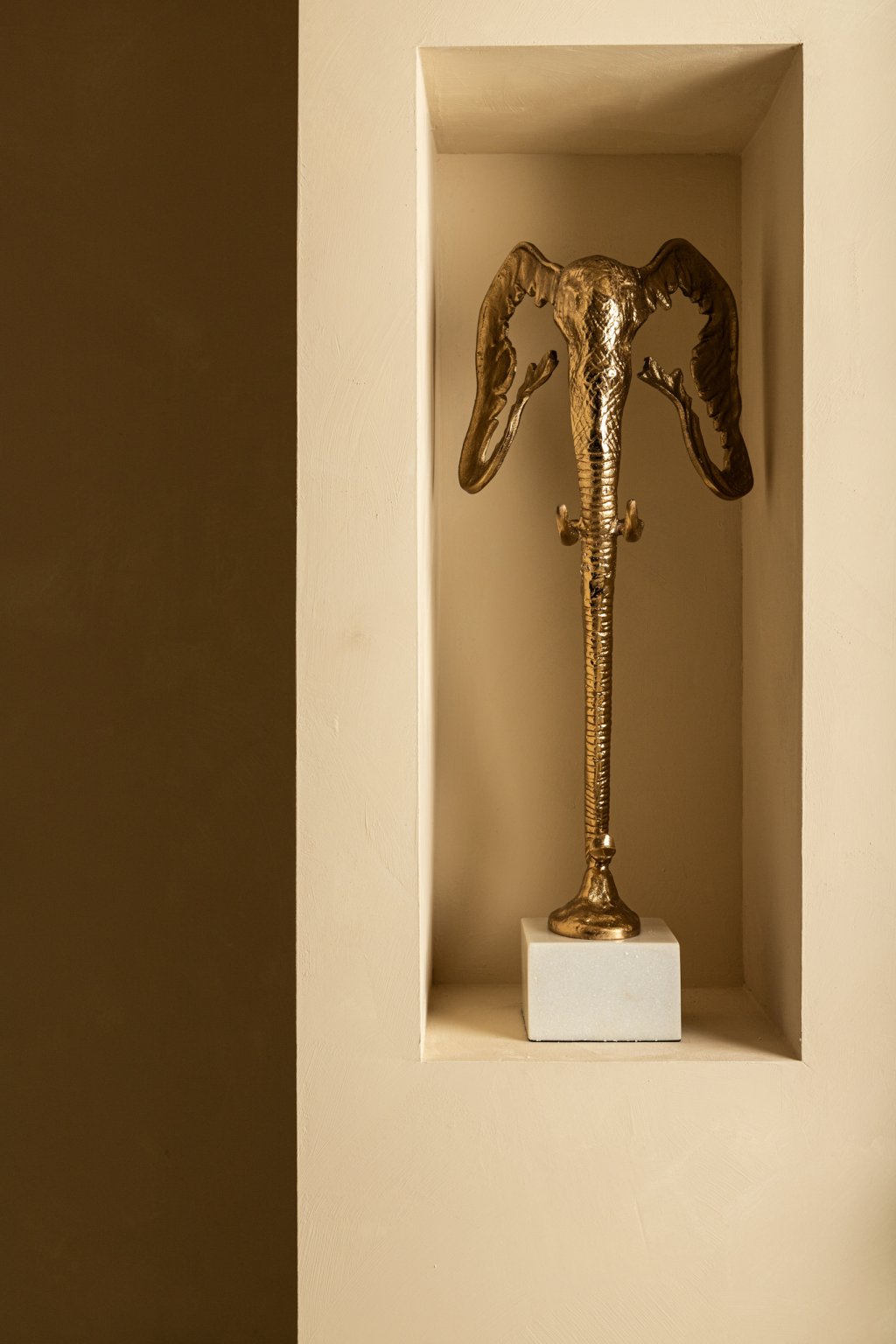 Het Horton Champagne Alu Elephant Statue Marble Base S is een stijlvol decoratief beeld dat modern design en luxe combineert. Gemaakt van hoogwaardig gegoten aluminium met een champagnekleurige afwerking, toont dit beeld een slanke, licht-abstracte olifantenkop op een stevige marmeren basis.