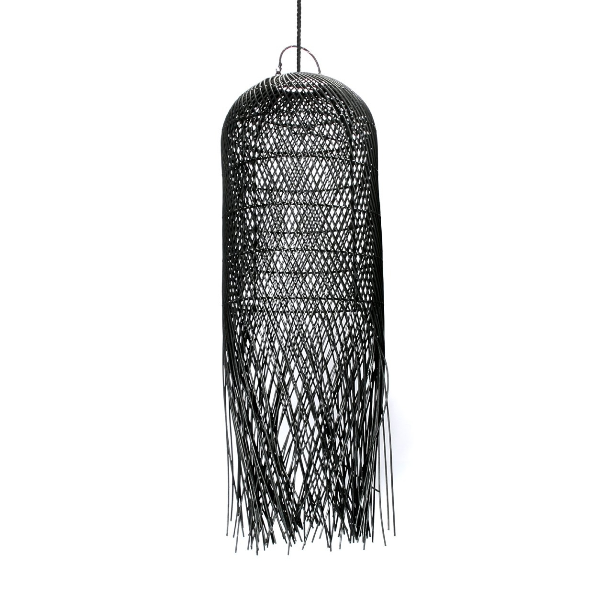 Handgemaakte zwarte rotan hanglamp in medium formaat. Het langgerekte silhouet verzacht het licht en brengt warme, natuurlijke textuur in je interieur.
