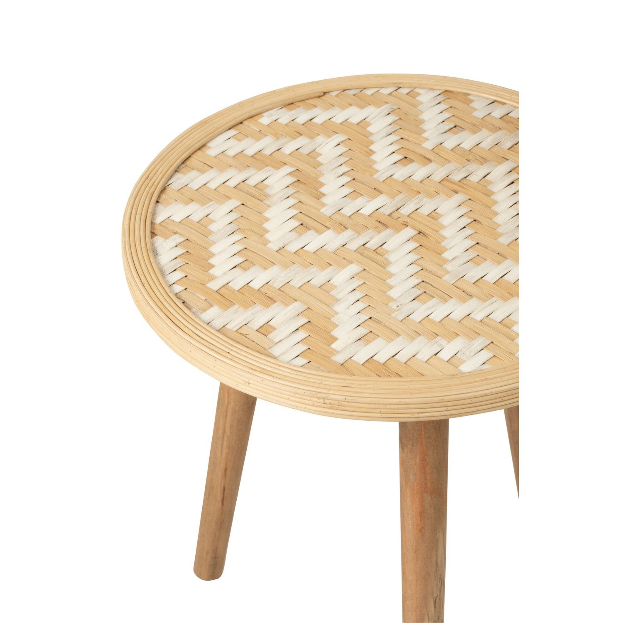 Set van 3 stijlvolle J-Line bijzettafels van bamboe en hout in naturel/wit. Perfect als salontafel, nachtkastje of decoratieve toevoeging. Compact, licht en veelzijdig.