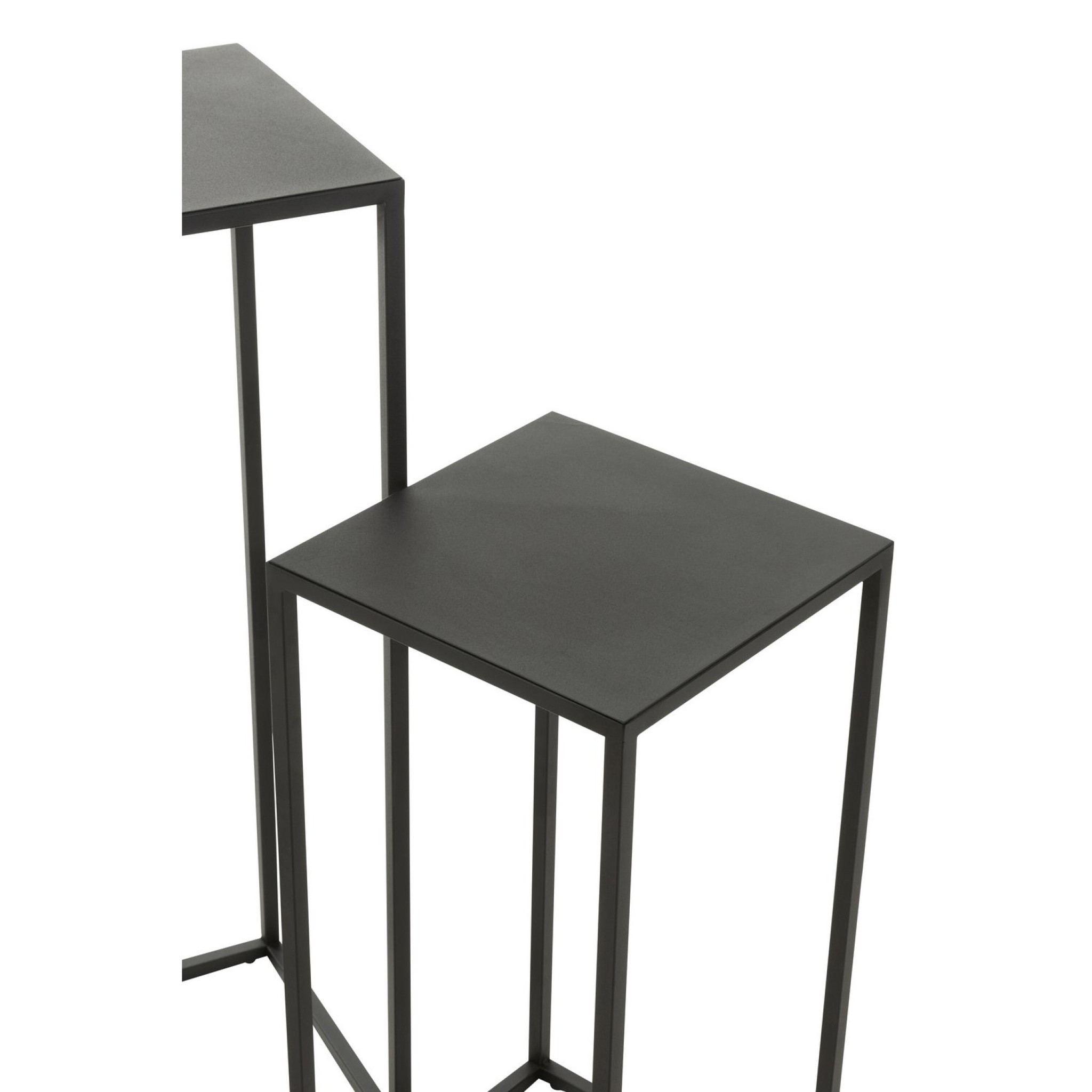 Set van 2 vierkante zwarte metalen bijzettafels van J-Line, industrieel en minimalistisch. Perfect als bijzettafel, plantentafel of decoratieve toevoeging in elk modern interieur.