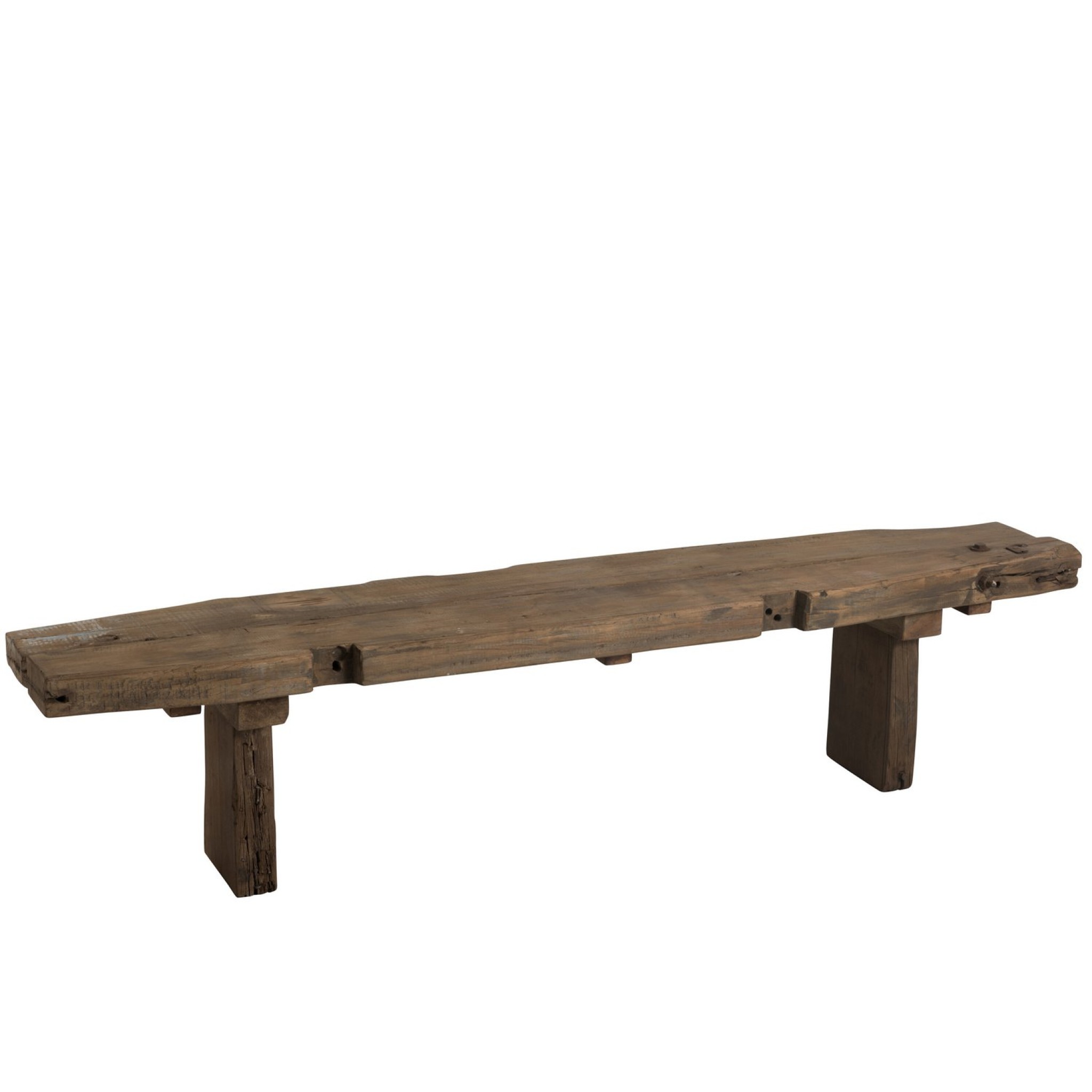 Stijlvolle J-Line Brut bank van gerecycled hout in bruin. Afmetingen 190×38×46 cm. Duurzaam, robuust en perfect als eetkamerbank of decoratieve zitplek in woonkamer of hal.