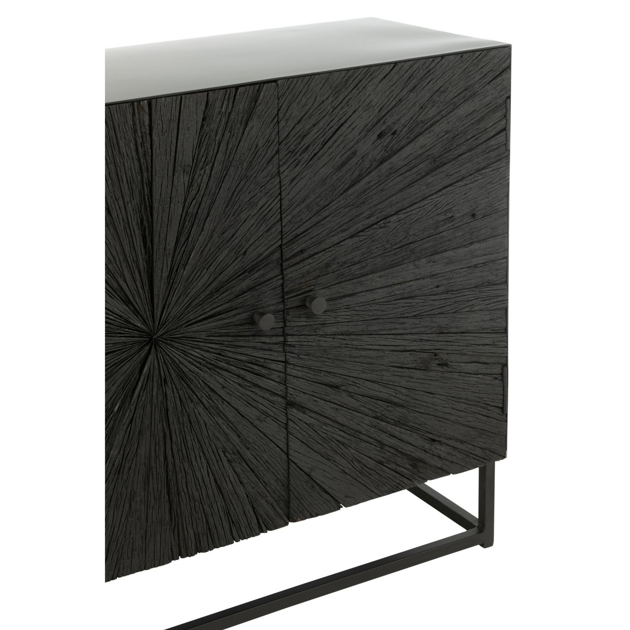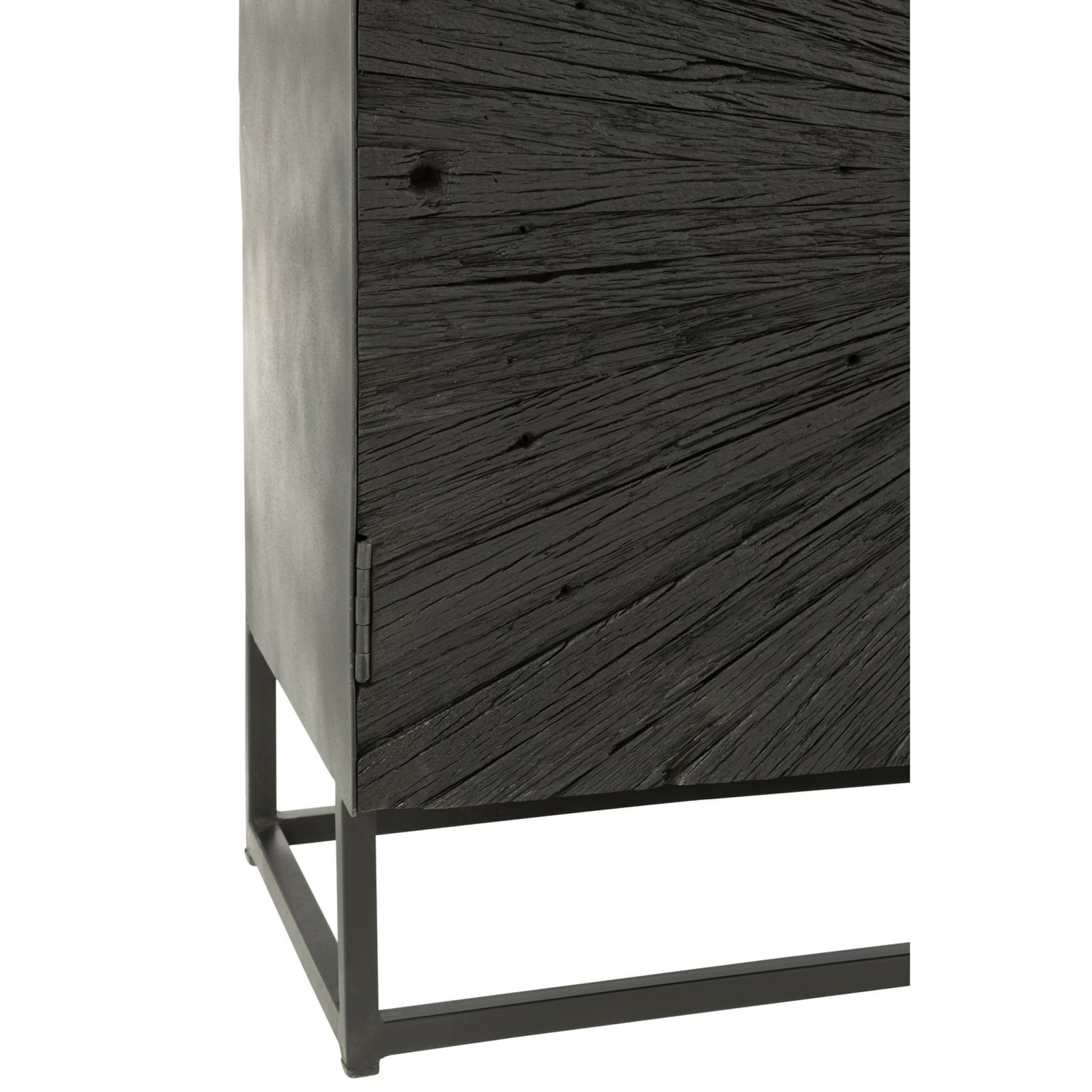 Stijlvolle zwarte buffetkast van J-Line, gemaakt van hout en ijzer. Afmetingen 120×38×81 cm. Perfect voor opbergen van boeken, media en persoonlijke items in moderne en industriële interieurs.