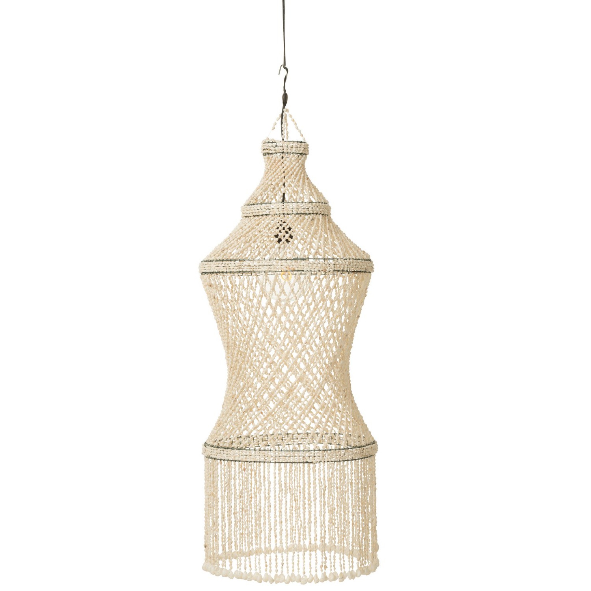 Handgemaakte J-Line lampenkap Lisa van schelpen in naturel tinten. Boho-chic design, 128 cm hoog, perfect voor stijlvolle verlichting in huis.