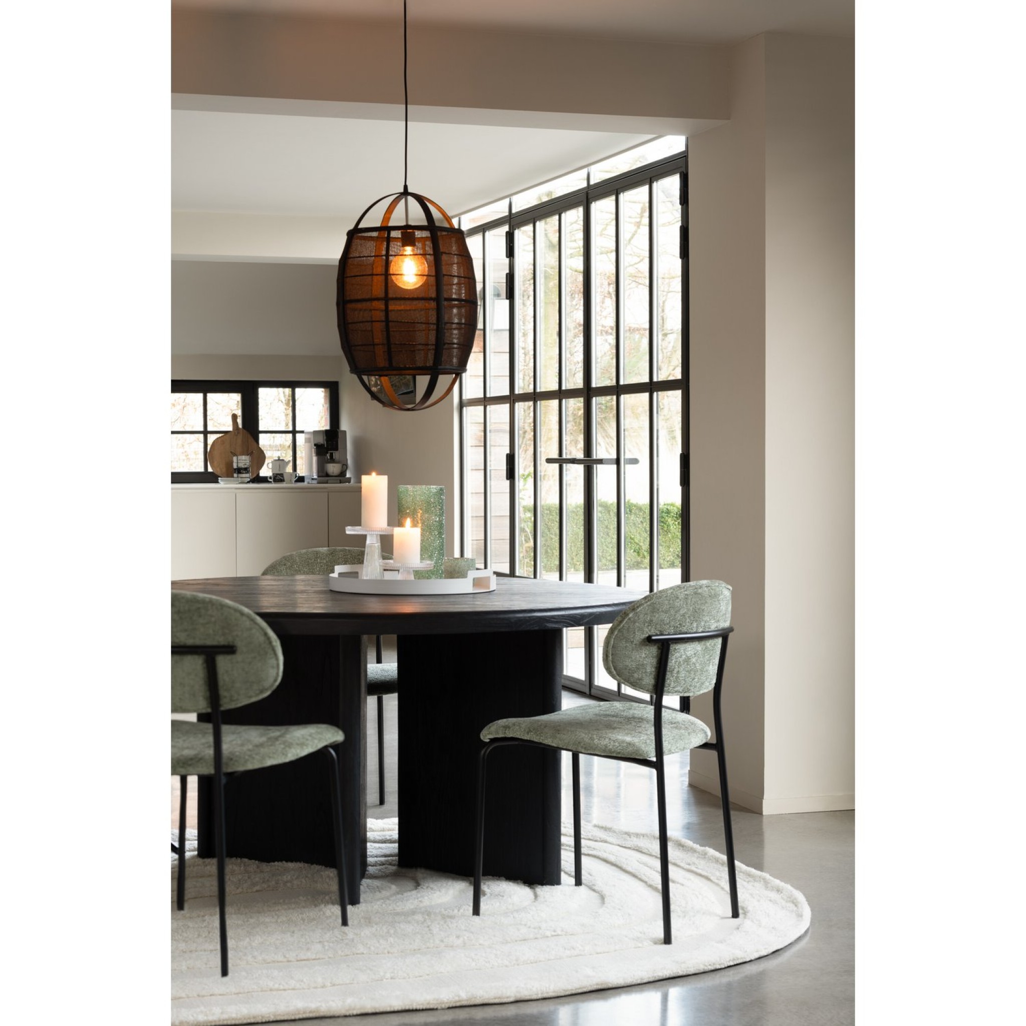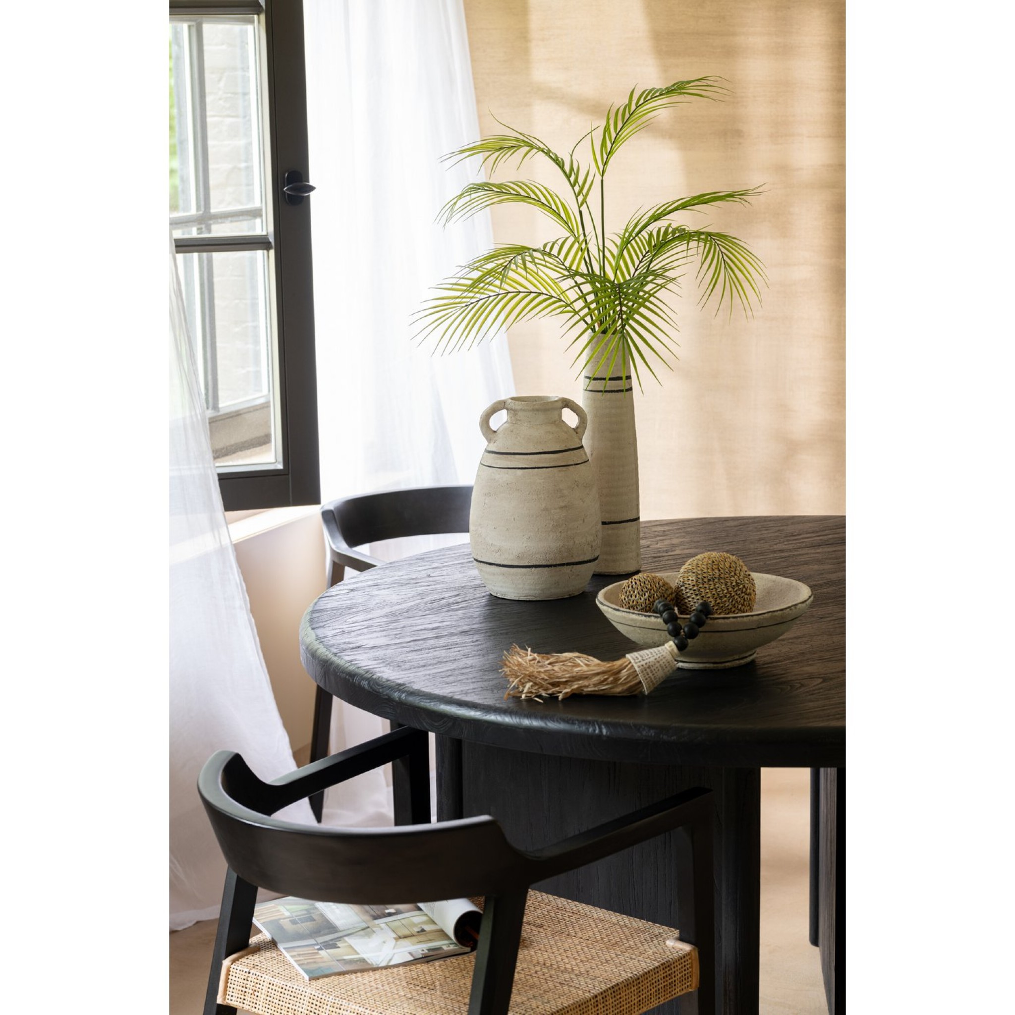 Ronde tafel van zwart teak- of houtmateriaal. Stijlvol en duurzaam, perfect als eettafel of statement piece in de woonkamer. Afmetingen: Ø150 x H75 cm, gewicht: 53 kg.