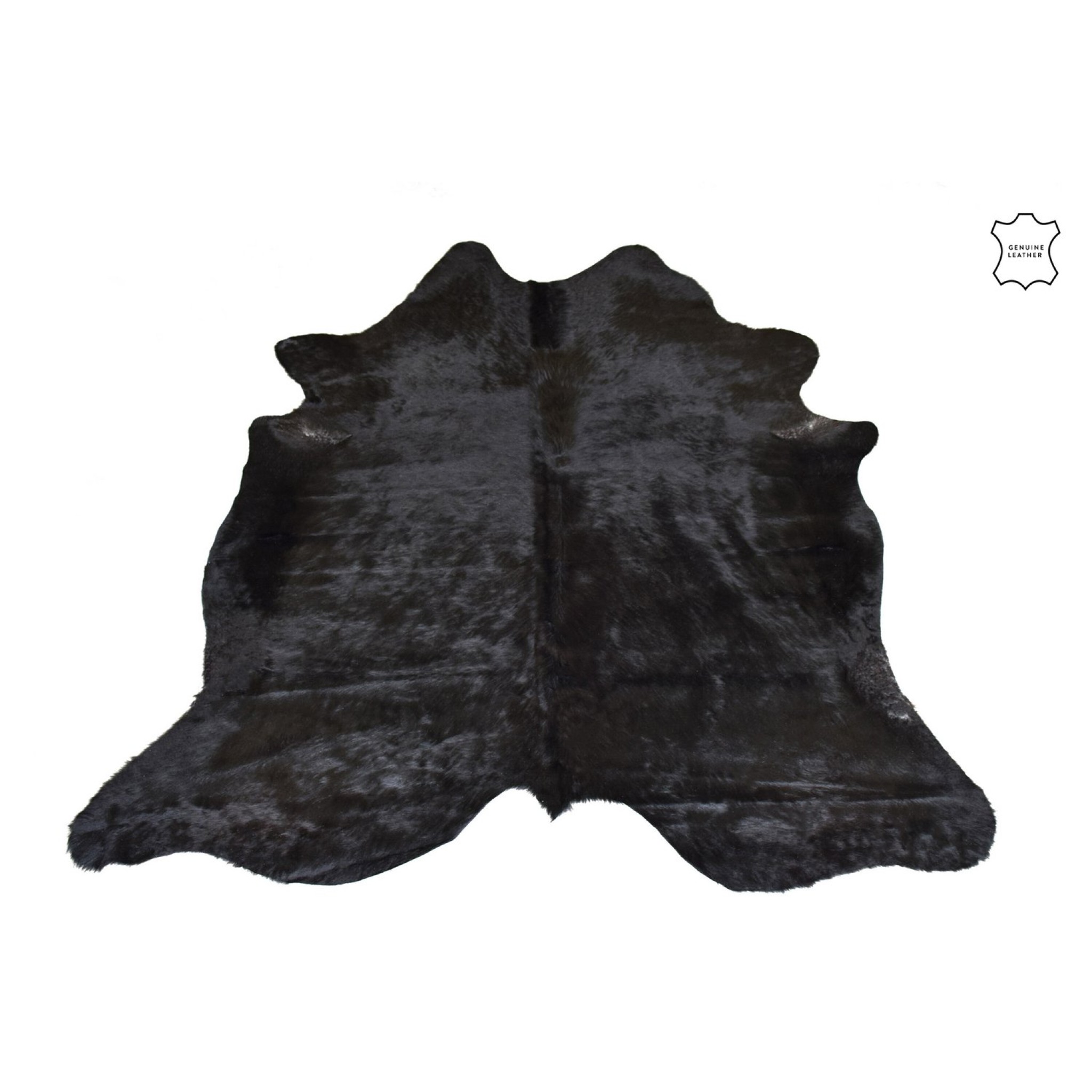 Stijlvol zwart koeienvel tapijt van J-Line in leer. 218x225 cm, handgemaakt in België. Luxe toevoeging voor woonkamer, slaapkamer of loungehoek.