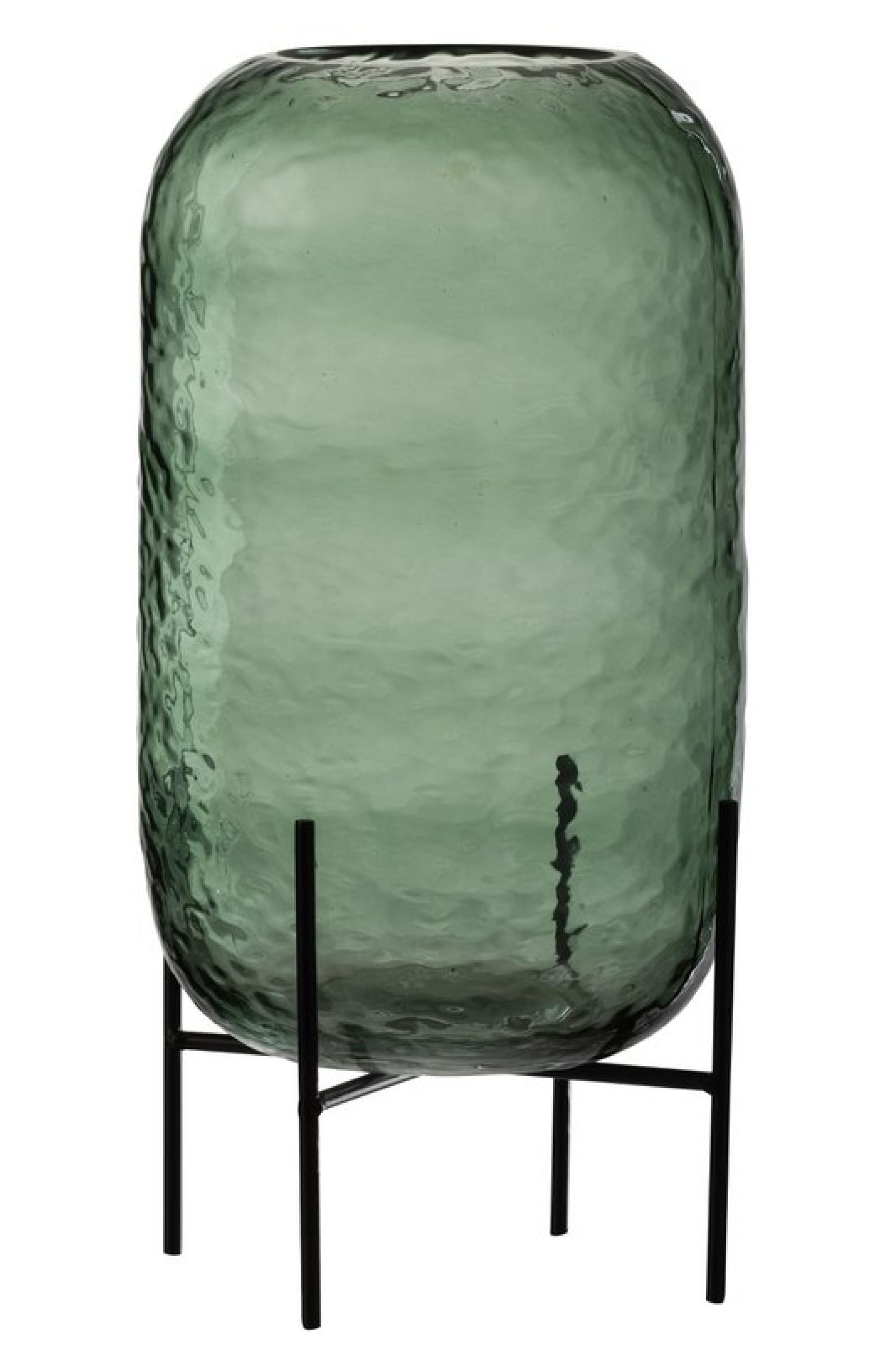 Stijlvolle groene glazen vaas van J-Line met onregelmatige vorm en metalen standaard. Een elegante eyecatcher van 38 cm hoog voor bloemen of decoratie.