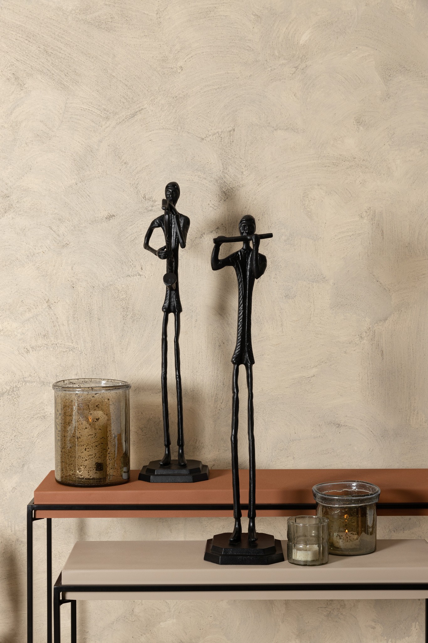 Elegant standbeeld van een man die fluit speelt, gemaakt van zwart gegoten aluminium. Sfeervol en decoratief voor elk interieur.