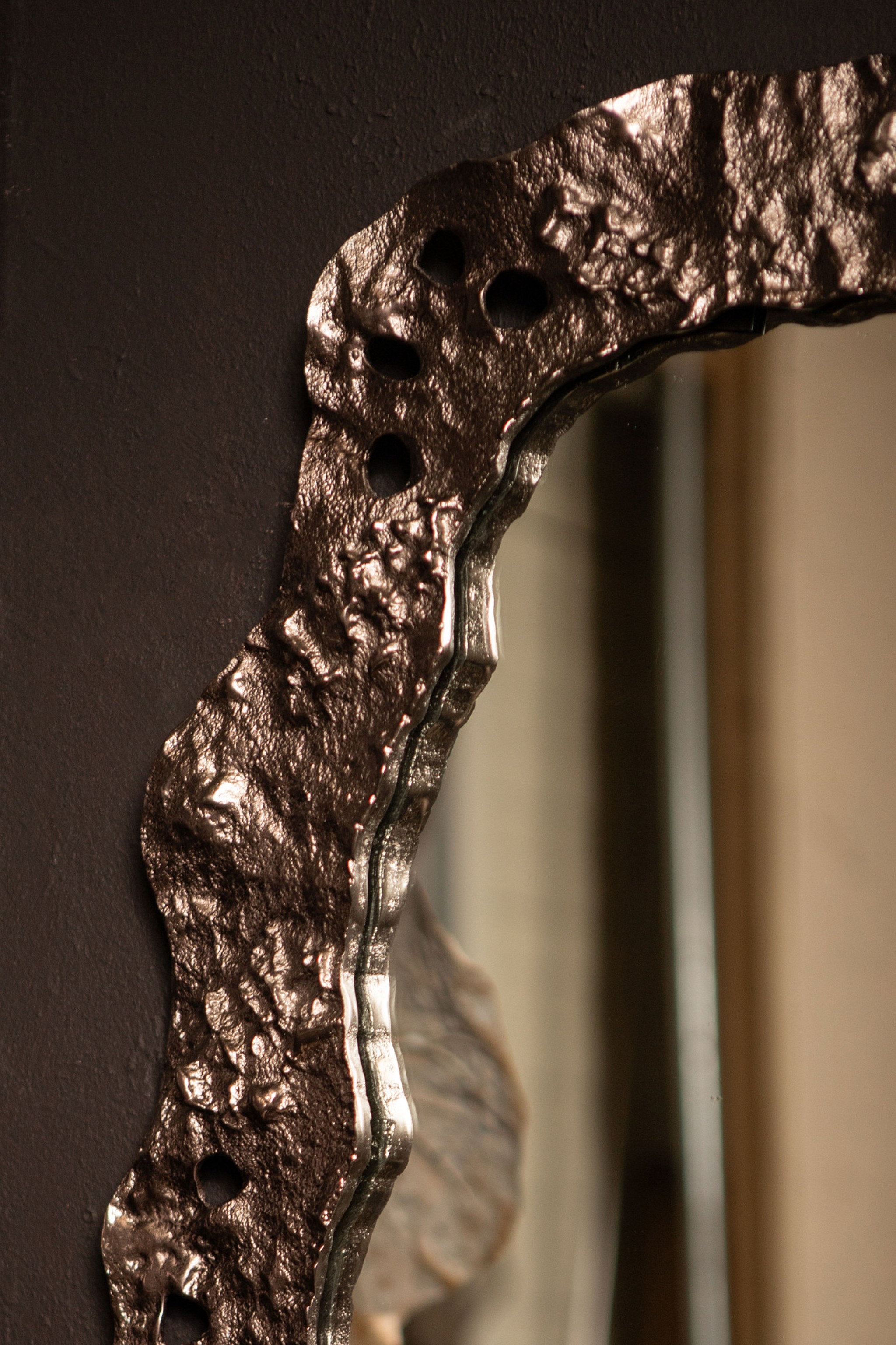 Handgemaakte aluminium spiegel in bronzen afwerking met ruwe ovale vorm. Luxe en karakter voor hal, woonkamer of slaapkamer. Afmetingen: 84x62 cm.
