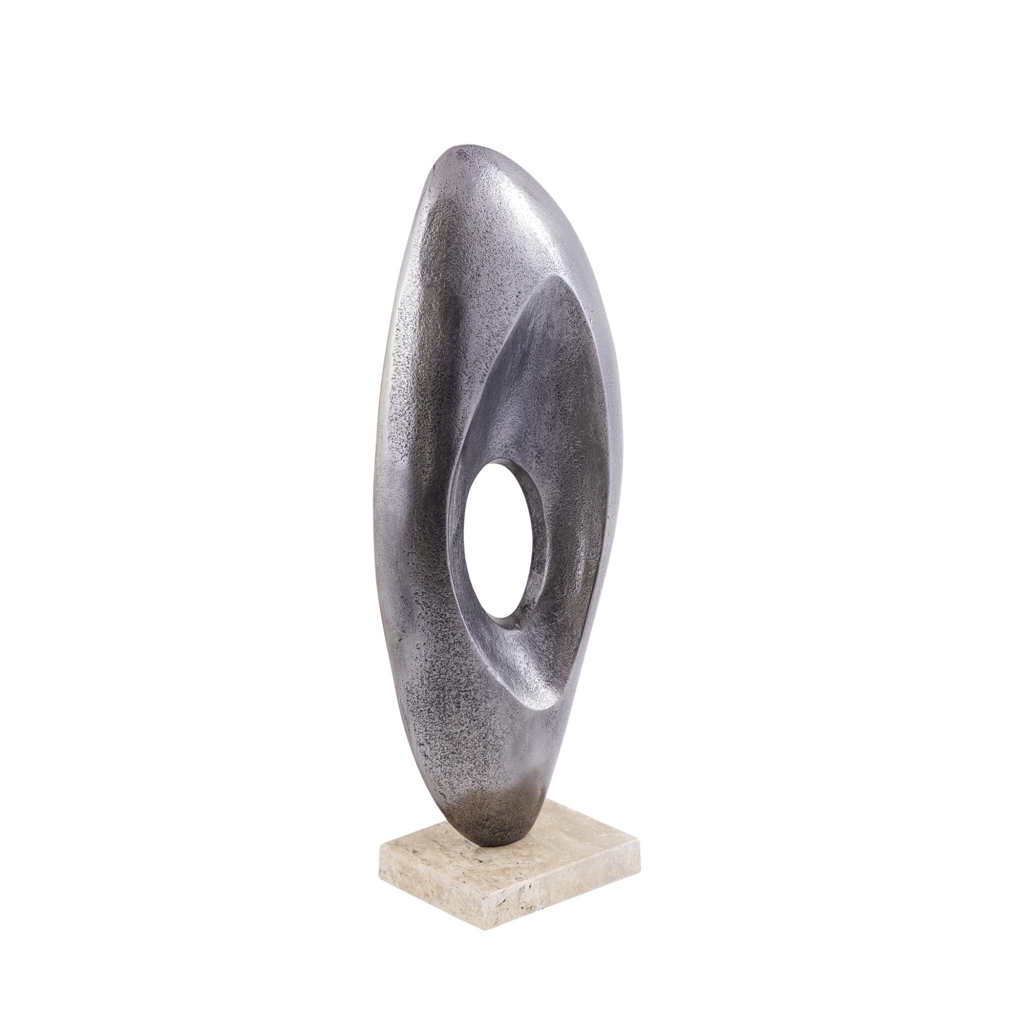 Nikkel aluminium sculptuur op travertin basis. Hoogte 46 cm, modern en elegant, perfect als stijlvol decoratief accent voor binnen.