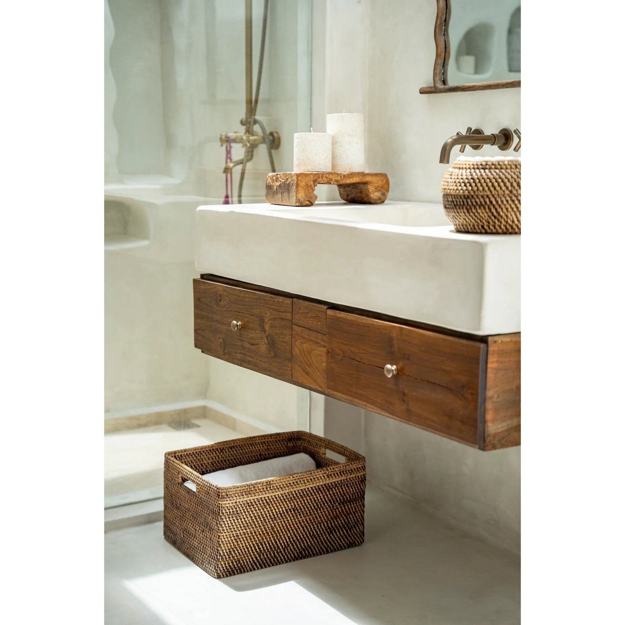 De Koloniale Tijdschriftenmand L is een handgevlochten rotan mand in naturel bruin. Ruim, stijlvol en functioneel, perfect voor het opbergen van tijdschriften, boeken en kleine spullen met een rustieke elegantie.