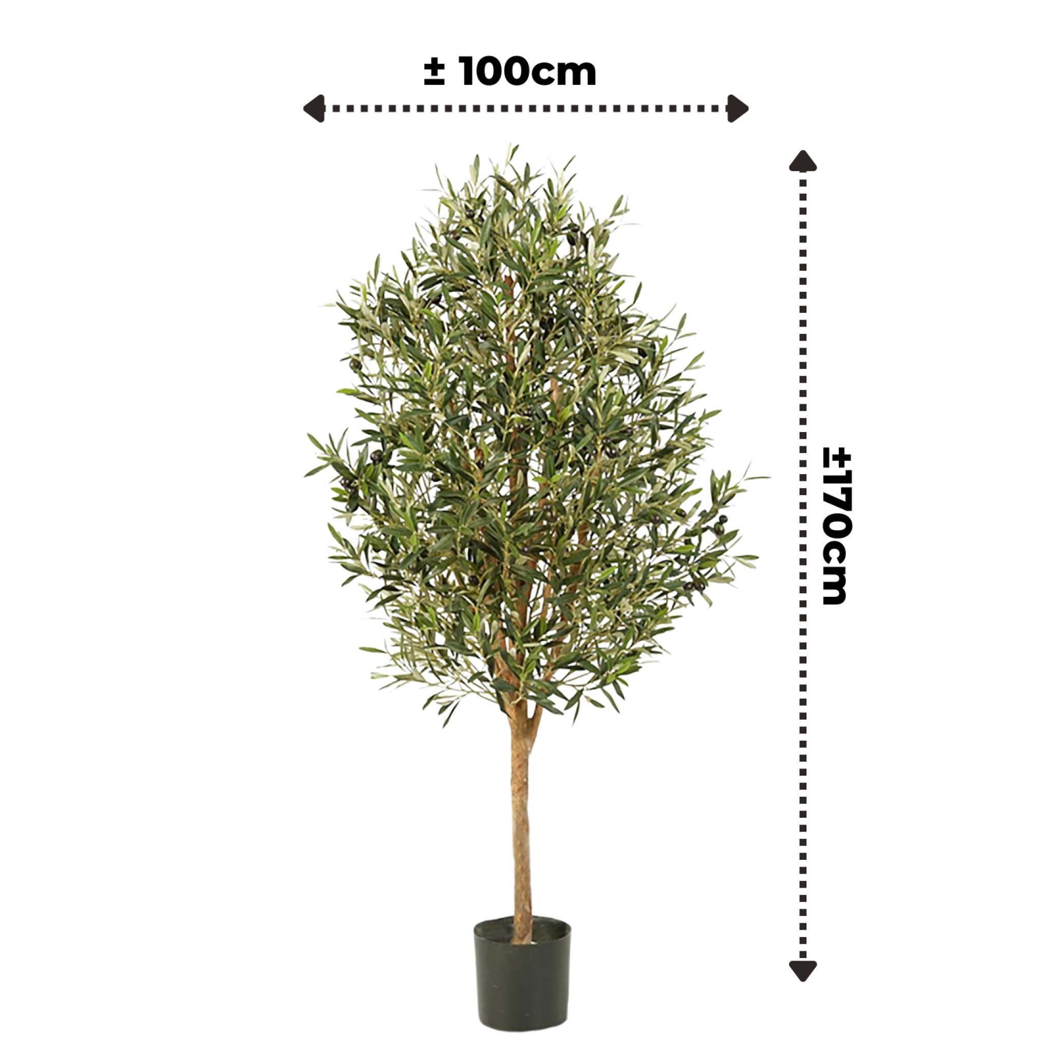 De boom wordt geleverd met een standaard zwarte kweekpot van 13 cm hoog en 15 cm in diameter, perfect om hem direct te plaatsen. Met een totale hoogte van 170 cm en een diameter van 100 cm is deze kunst olijfboom een opvallend statement in elke ruimte.
