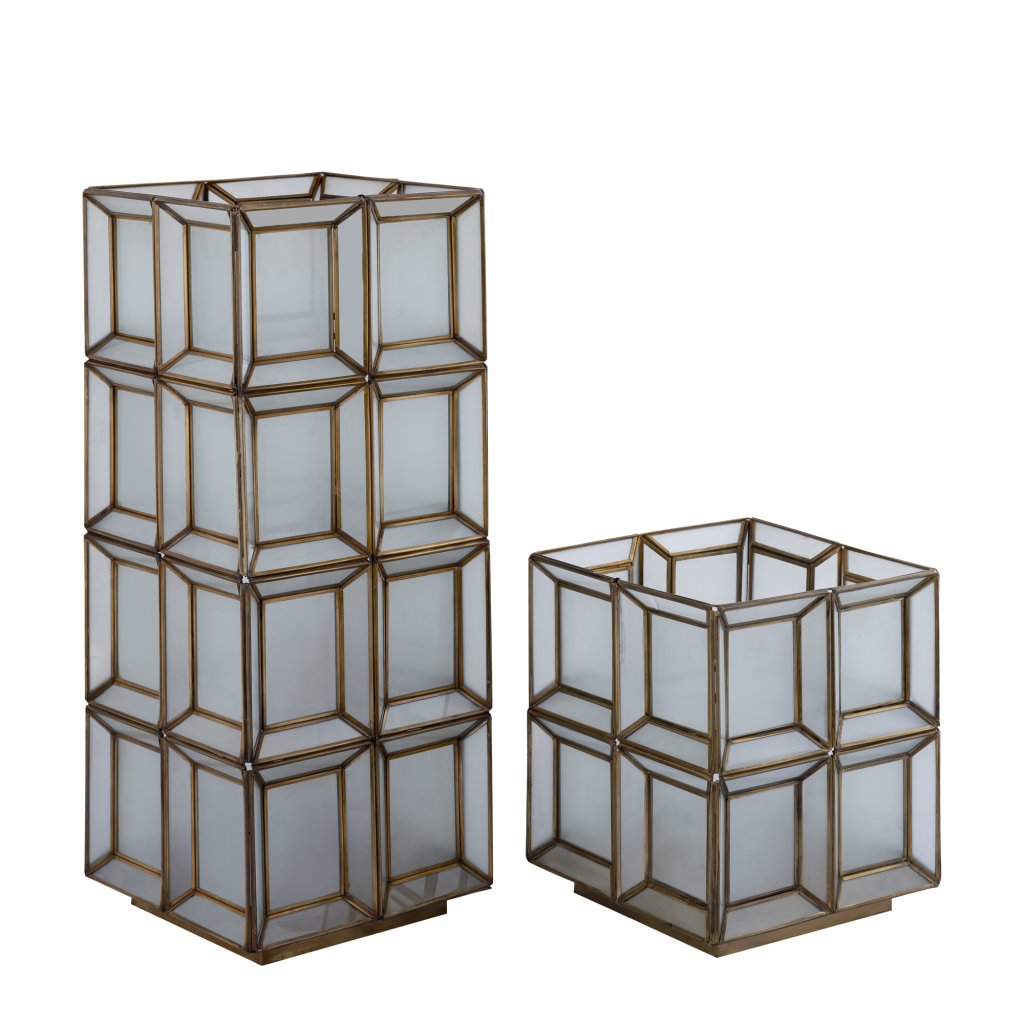 De Layra tafellamp (low) is een elegant designobject met een sculpturale uitstraling. Het zachte melkglas in rechthoekige vormen, met subtiel blauwgrijze tinten en donkere accenten, geeft iedere ruimte een warme, sfeervolle gloed.