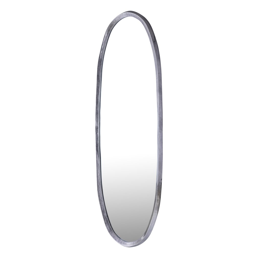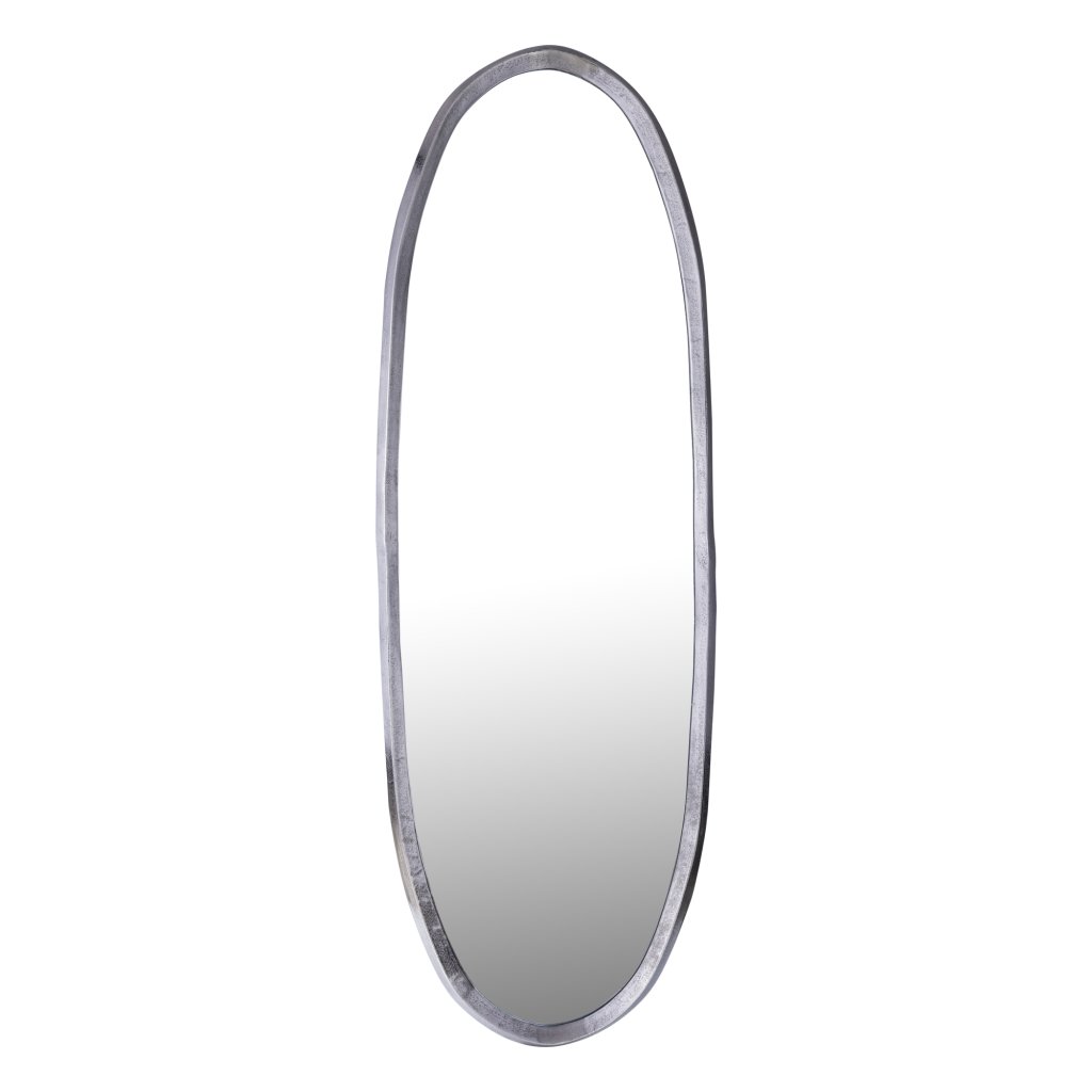 Stijlvolle grote ovale spiegel met irreguliere nickel aluminium rand. Luxe design dat licht en ruimte toevoegt aan elk interieur. Afmetingen: 61x178x3 cm.
