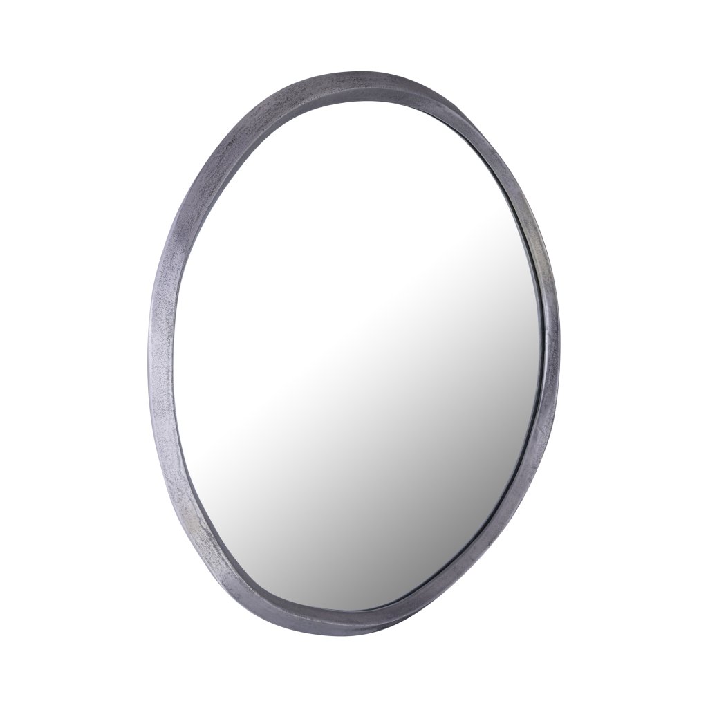 Ronde spiegel van aluminium met nikkelafwerking en onregelmatige rand. Stijlvol en modern statement piece uit de PTMD Collection. Afmetingen: 75x75x2 cm.