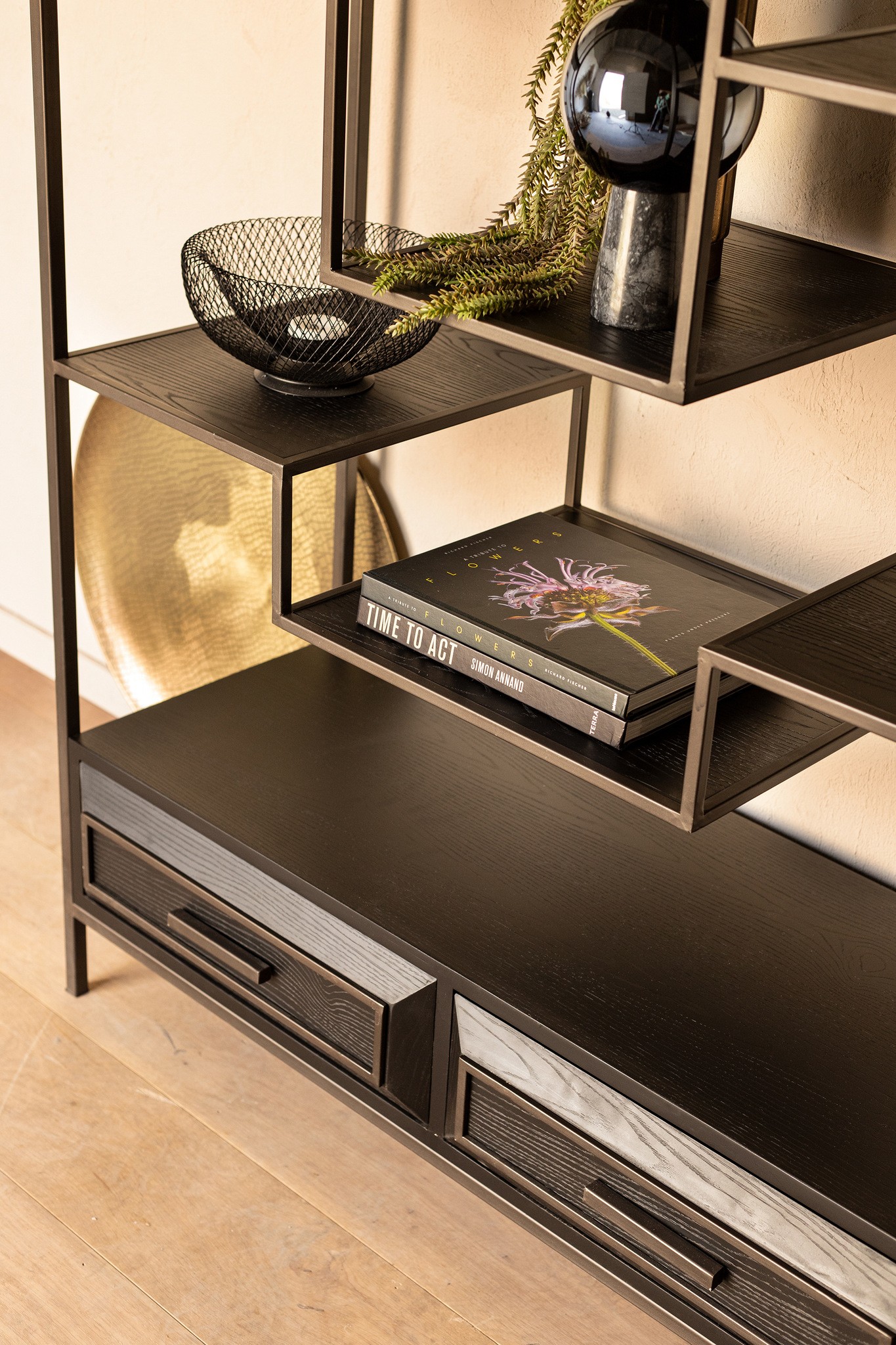 Strakke open kast van zwart hout met stevig metalen frame. De Lixly Open Cabinet combineert industrieel design met praktische opbergruimte en is perfect voor woon- of werkruimtes.