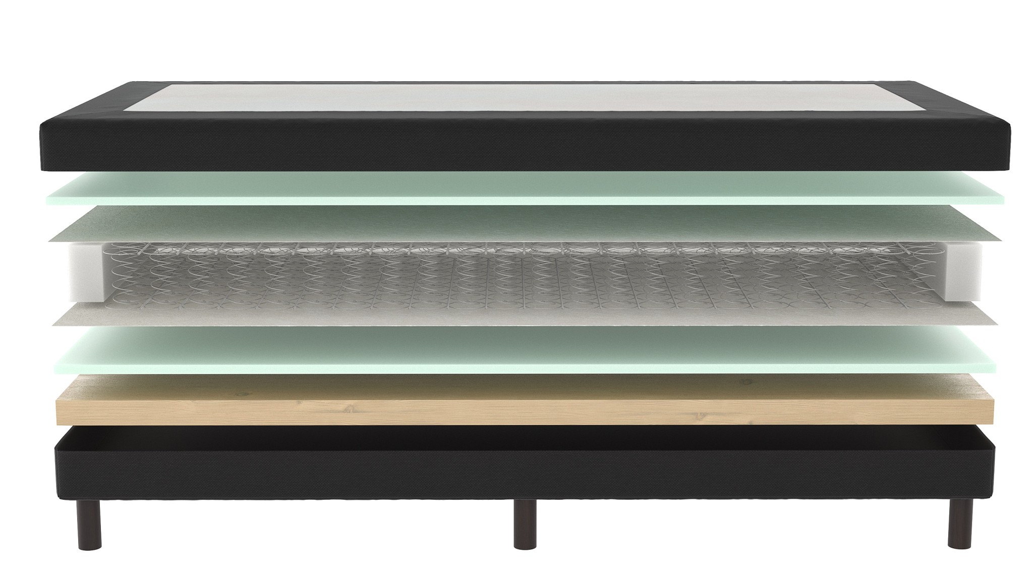 Losse zwarte boxspring met bonellvering, geschikt voor een matras naar keuze. Veerkrachtig, onderhoudsvriendelijk en belastbaar tot 120 kg per persoon.