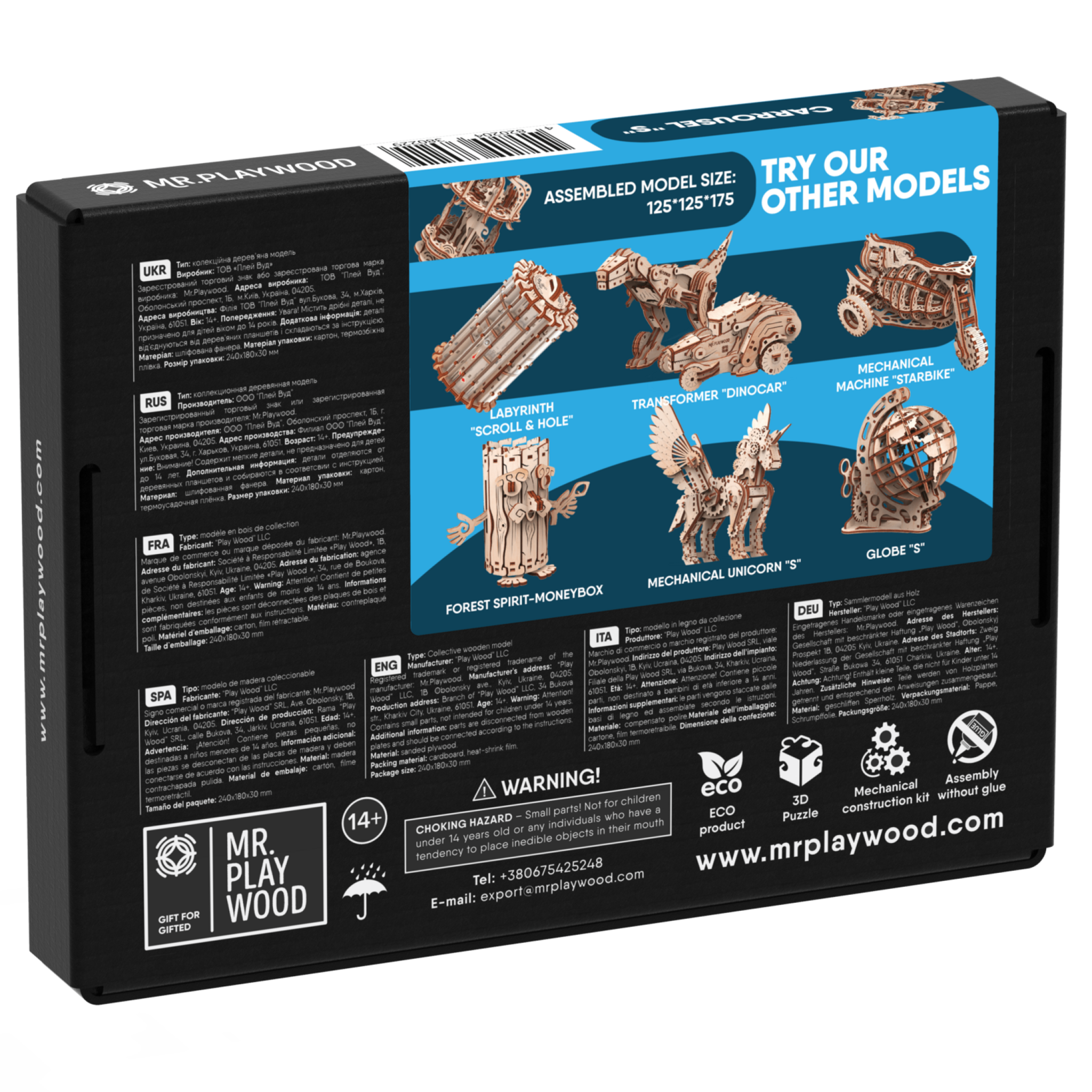 De Mr. Playwood 3D Houten Puzzel Carousel – Klein is een uitdagend en creatief modelbouwproject. Met 88 voorgesneden houten onderdelen zet je eenvoudig een prachtige, decoratieve carrousel in elkaar, zonder lijm.