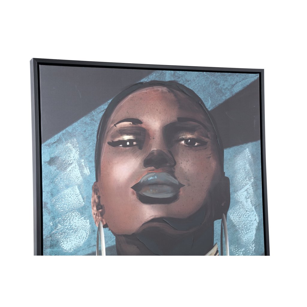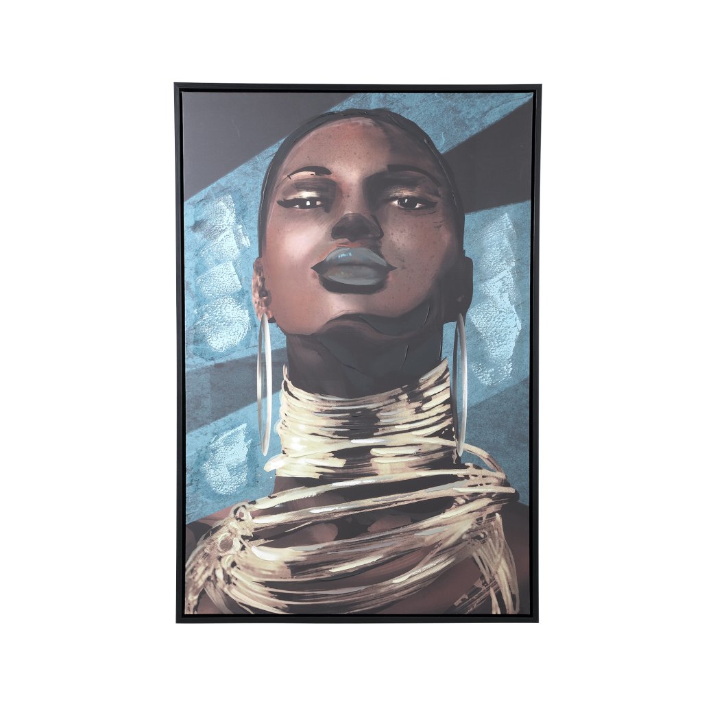 Klein rechthoekig polyester schilderij van een tribaal vrouwengezicht met gouden ringen en oorbellen. Stijlvol en kunstzinnig decor voor elke muur. Afmetingen: 63x93x4 cm.