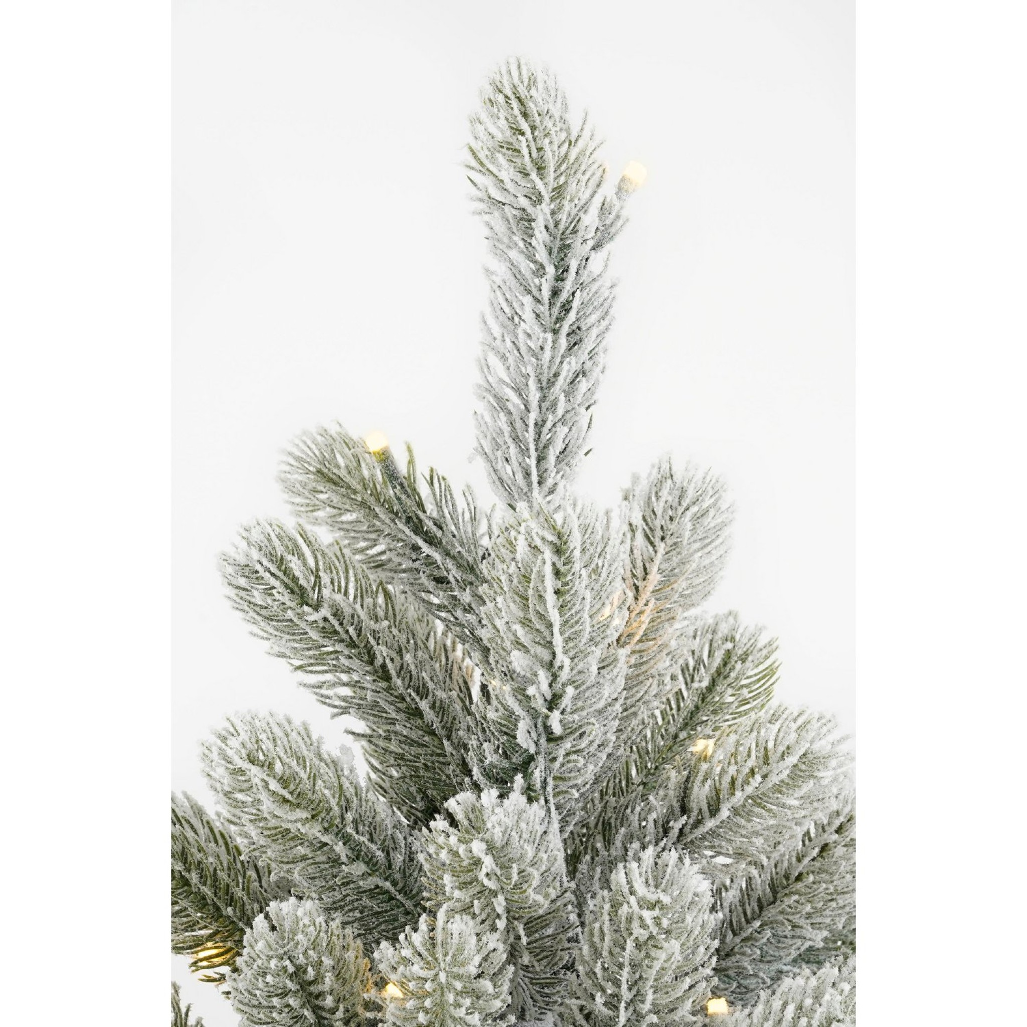 De subtiel besneeuwde takken zorgen voor een sfeervol accent, terwijl de 175 natuurgetrouwe PE-dennentakjes de boom bijna niet van echt onderscheiden. De boom is uitgerust met 50 warmwitte LED-lampjes die werken op 4 AA-batterijen, zodat je hem overal kunt plaatsen zonder gedoe met snoeren.