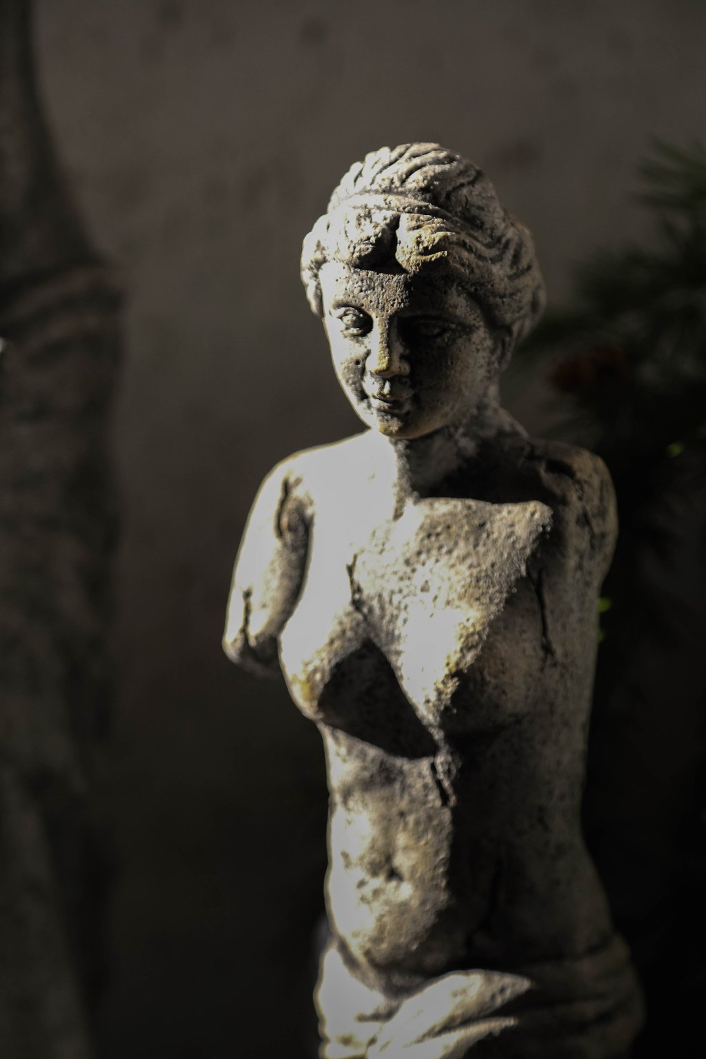 Elegant vrouwenbeeld van zwart cement. Modern, stijlvol en decoratief ornament voor interieur of kantoor.