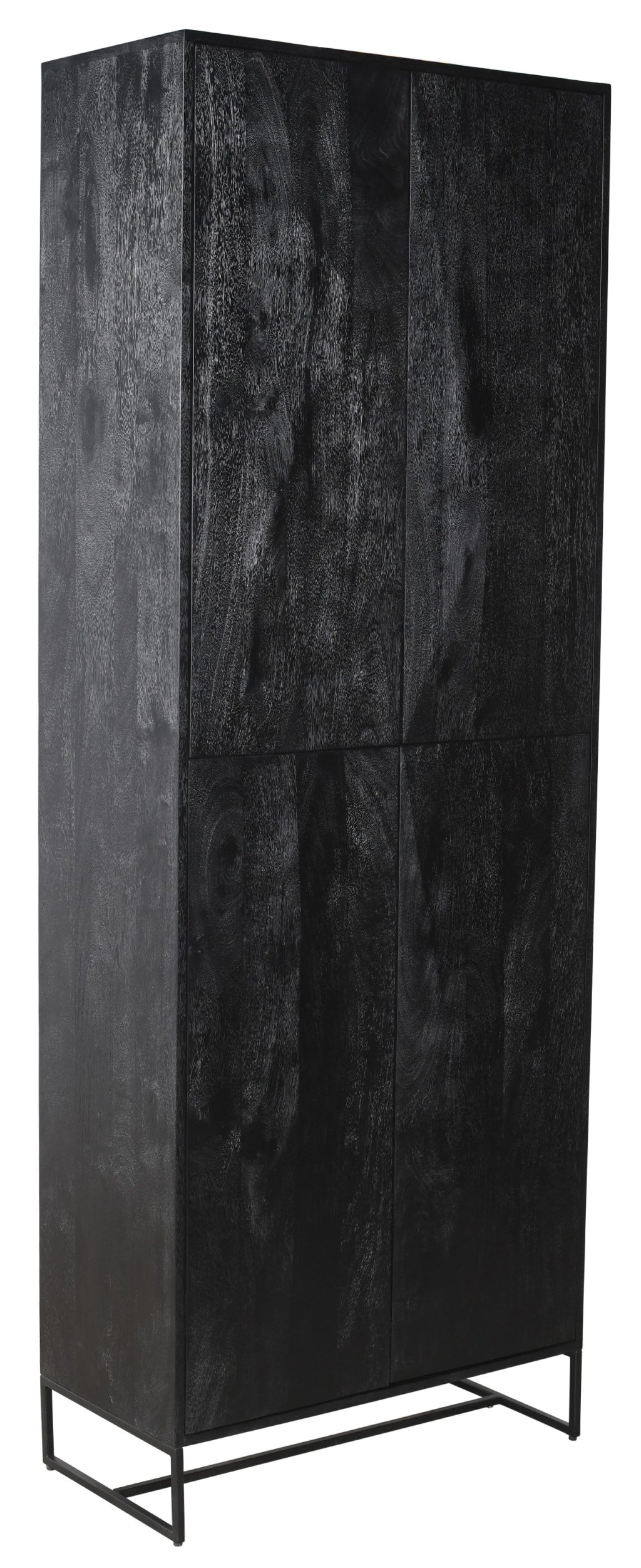 Stoere zwarte kast met vier deuren, geometrische deurdetails en een stevig metalen onderstel. Ideaal voor opbergruimte en stijlvol display in moderne of industriële interieurs. Afmetingen: 80x220x40 cm.