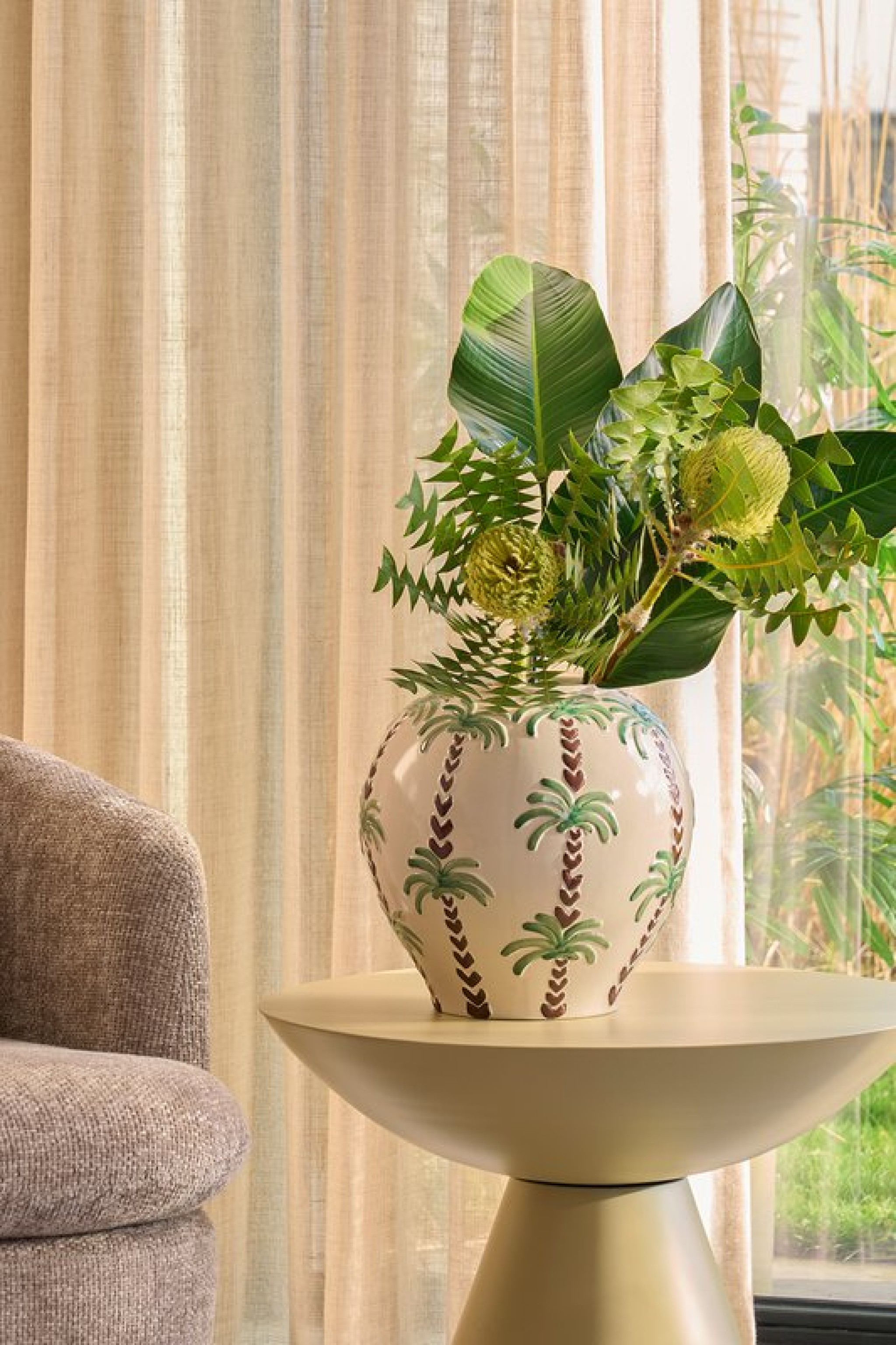 Breng een zomerse sfeer in huis met de Paradiso vaas van Mica Decorations. Deze handgemaakte keramieken bloemenvaas heeft een print van palmbomen op een off-white basis.