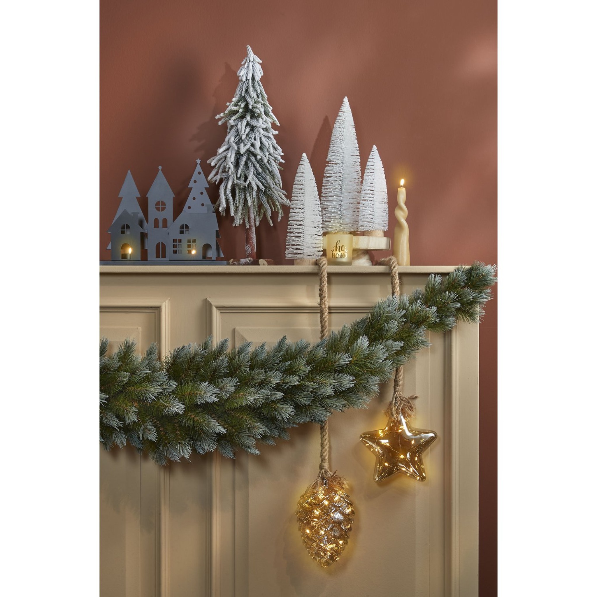 De slinger is voorzien van groene PVC-naalden met witte uiteindes, wat zorgt voor een subtiel bevroren effect — net alsof hij rechtstreeks uit een winters bos komt. De natuurlijke bruine takjes en de stevige naalden geven de guirlande een levensechte uitstraling.