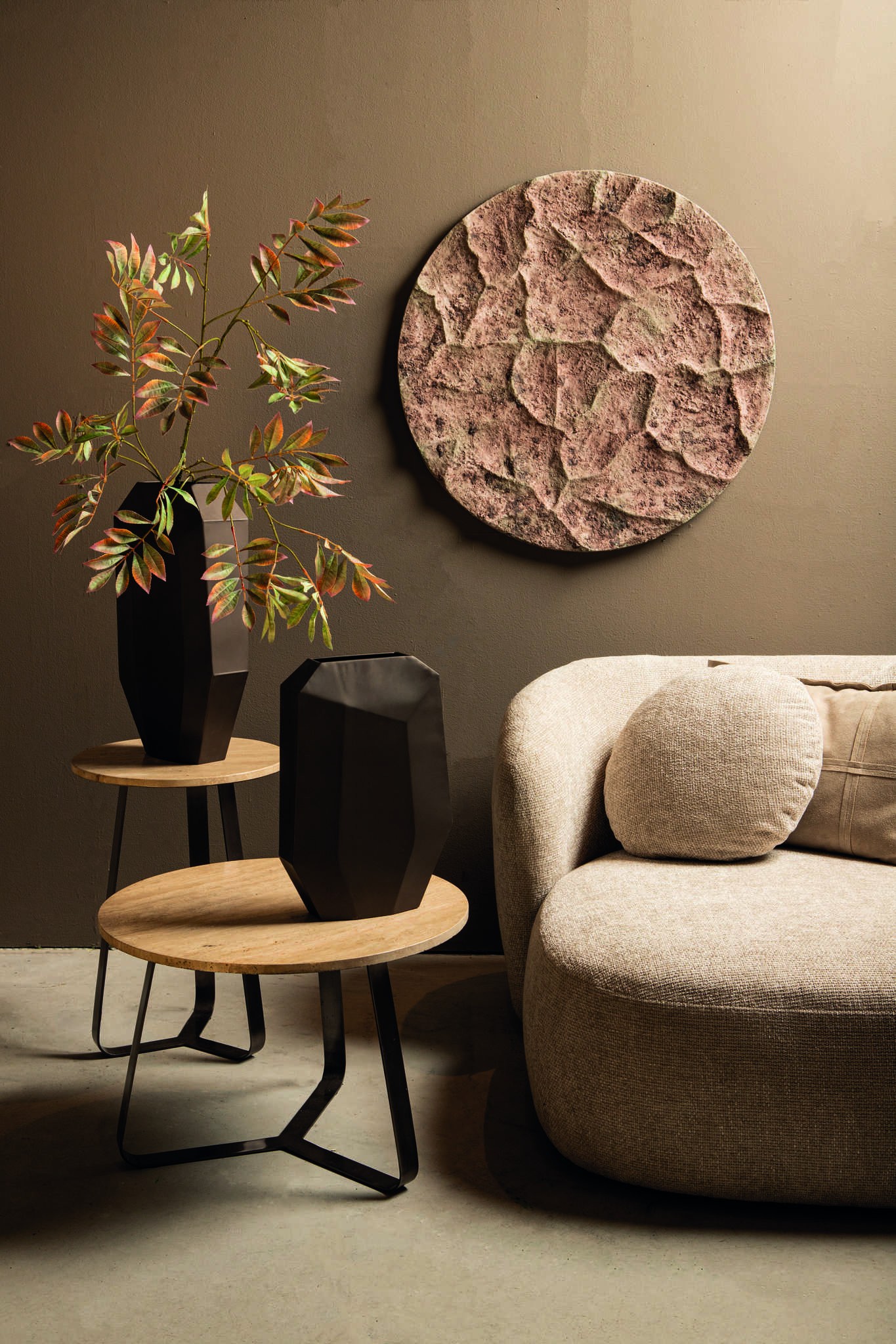 Dankzij de ronde vorm en de textuurrijke afwerking ontstaat een speels spel van licht en schaduw, waardoor het paneel een opvallend statement piece wordt in elke ruimte. Het handgemaakte karakter zorgt ervoor dat elk exemplaar uniek is en een authentieke uitstraling heeft.