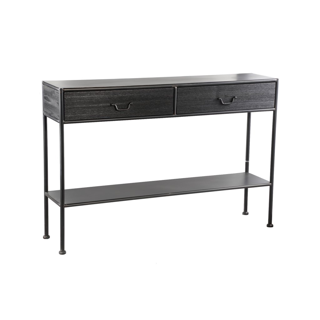 Stijlvolle zwarte houten wandtafel met metalen frame, twee lades en extra onderplank. De Ray sidetable combineert klassiek design met moderne functionaliteit.