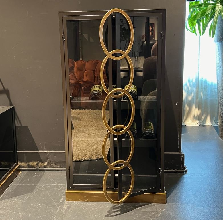 Stijlvolle zwarte metalen wijnkast met smoky glazen deuren en elegante gouden ringen. Perfect voor het opbergen en presenteren van wijnflessen in een modern interieur.